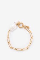 Bracelet plaqué or de Sissy-Boy. Le bracelet est de couleur dorée et est orné d'une perle. Évitez tout contact avec des produits cosmétiques (parfum, laque, démaquillant, dissolvant, huile de corps, crème solaire, gel désinfectant pour les mains et déodorant). Ne portez pas les bijoux sous la douche, dans le bain ou lorsque vous vous baignez. Le chlore, en particulier, peut endommager ou décolorer de façon permanente les bijoux. Dimensions : 18 cm. Composition : 100% acier.