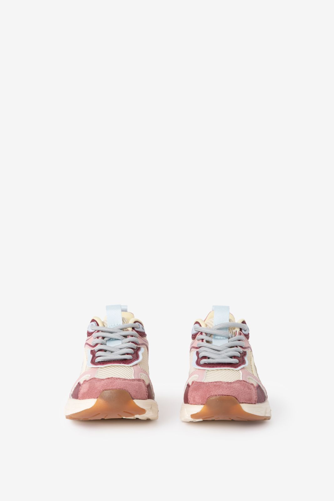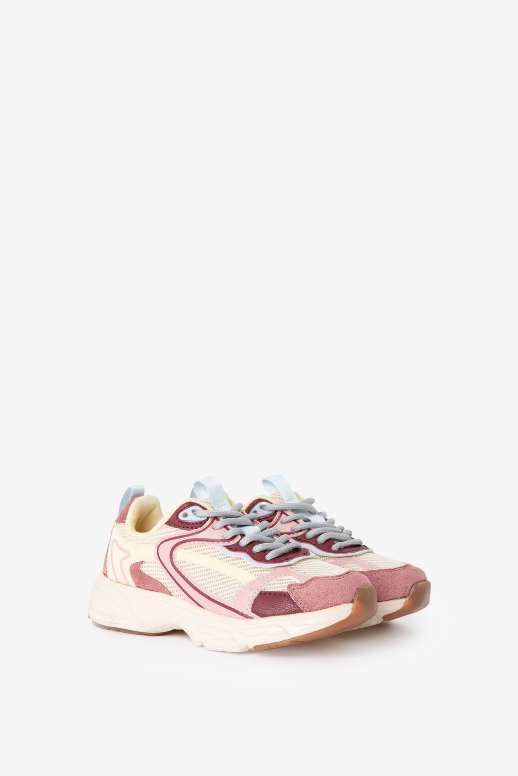Baskets roses de Sissy-Boy. Les baskets ont une palette de couleurs composée de rose, blanc, jaune, violet, bleu et marron. Les baskets ont également une semelle sportive à profil haut, un bout rond et des lacets. Composition : 100% polyuréthane.