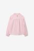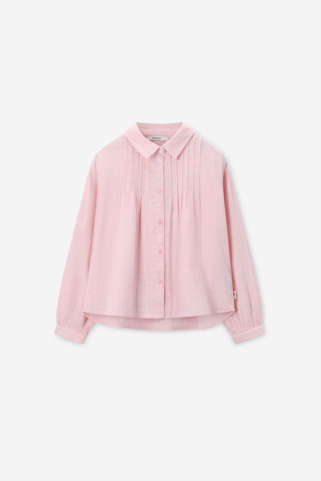 Blouse rose clair de Sissy-Boy. La blouse a des manches longues avec épaules basses, une fermeture boutonnée, un col et des plis sur le devant. La blouse est également dotée d'une petite fleur dorée brodée dans le dos. Composition : 100% coton.
