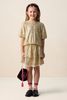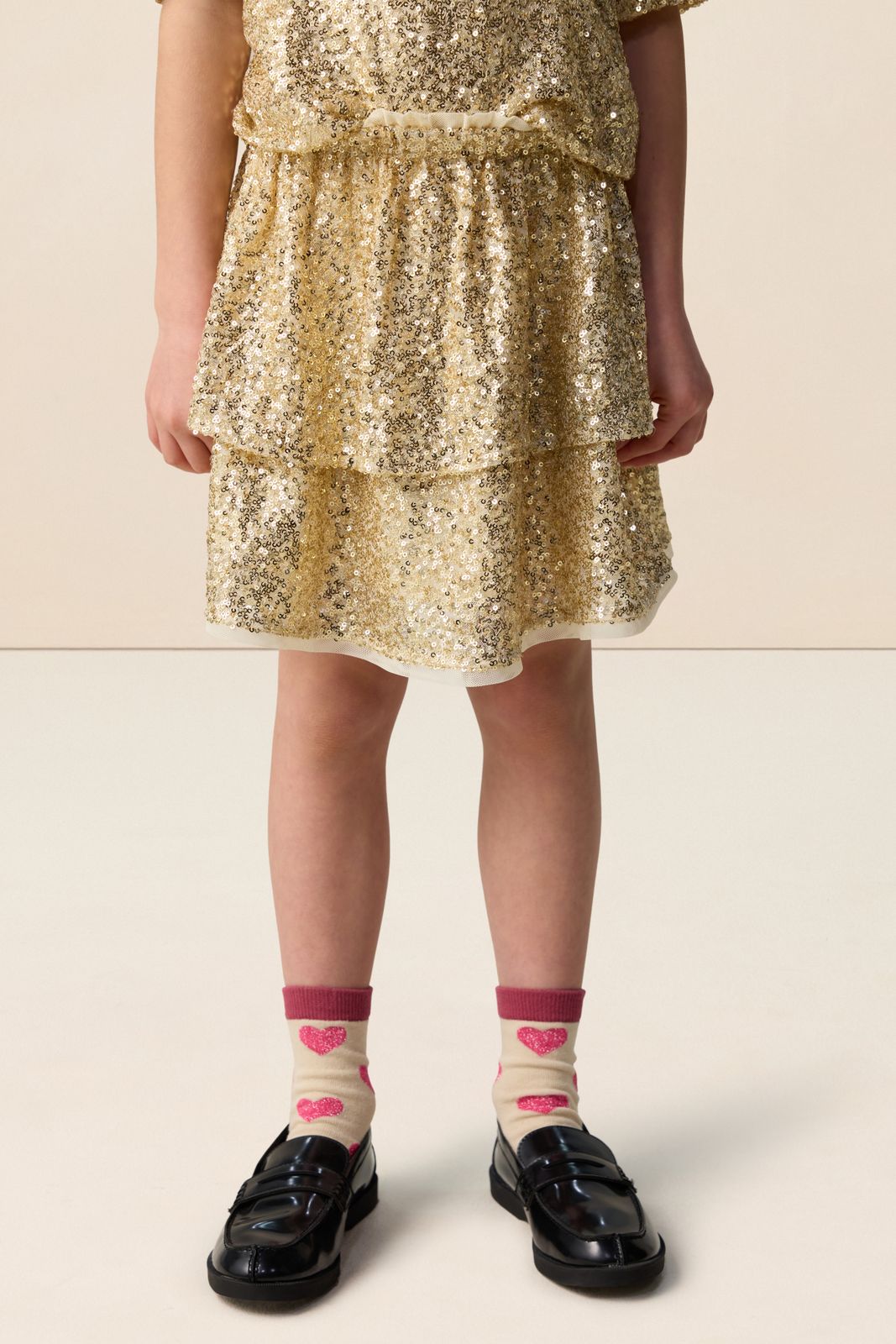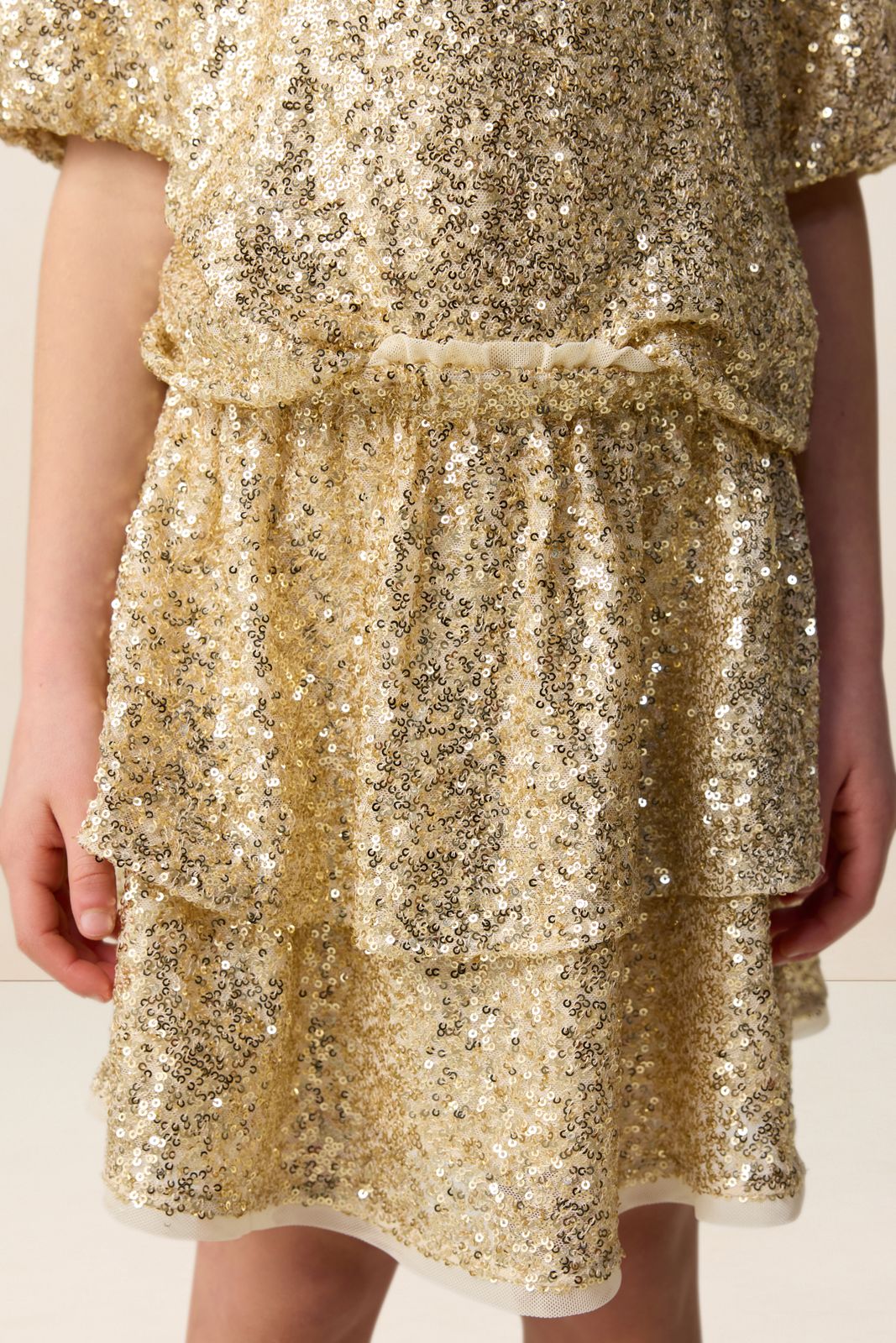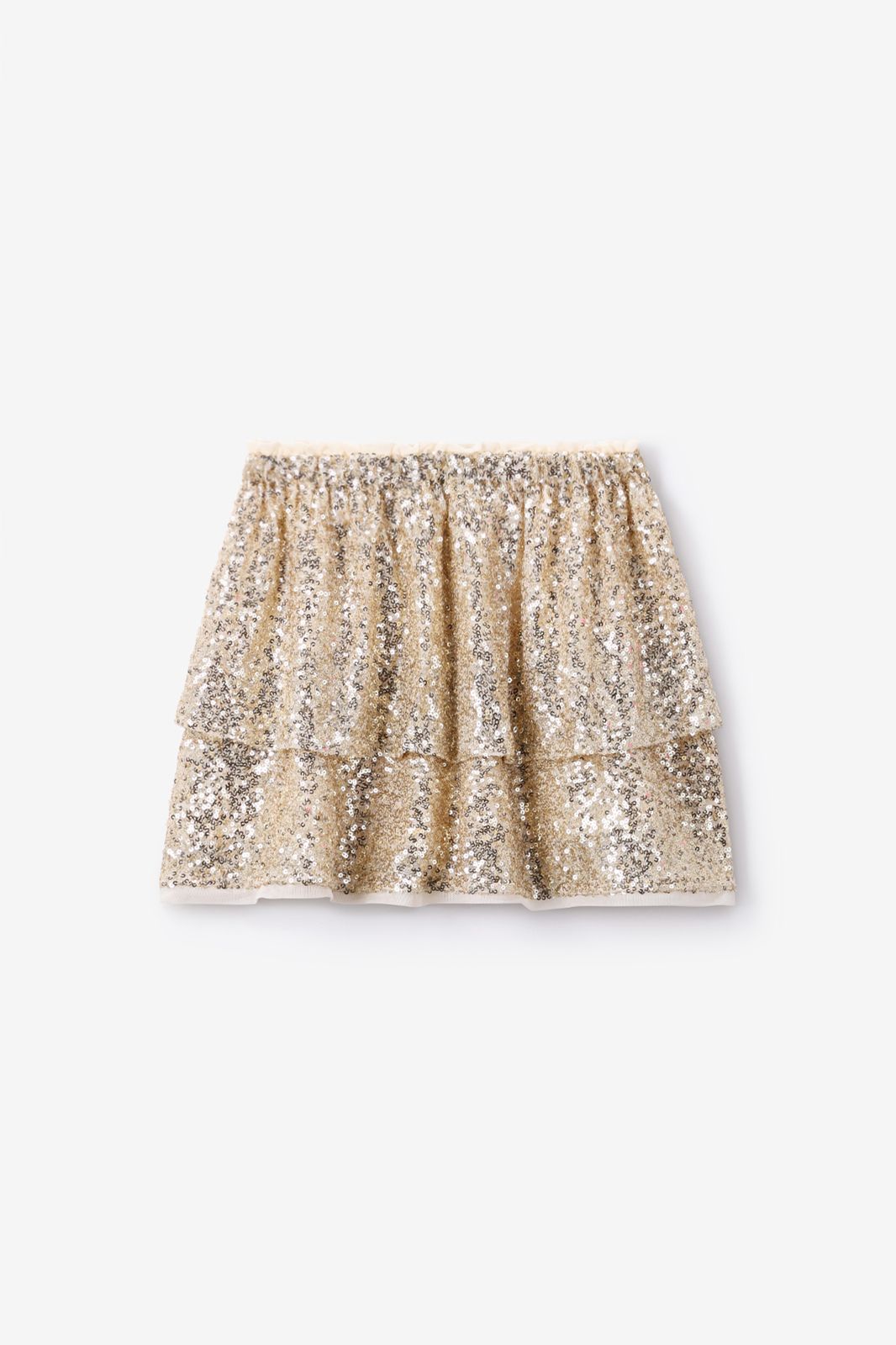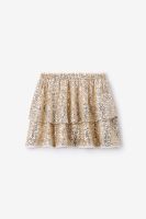 Jupe dorée de Sissy-Boy. La jupe courte a une taille haute, des volants et une ceinture élastique. La jupe est également dotée de paillettes dorées. Composition : 95% polyester, 5% élasthane.