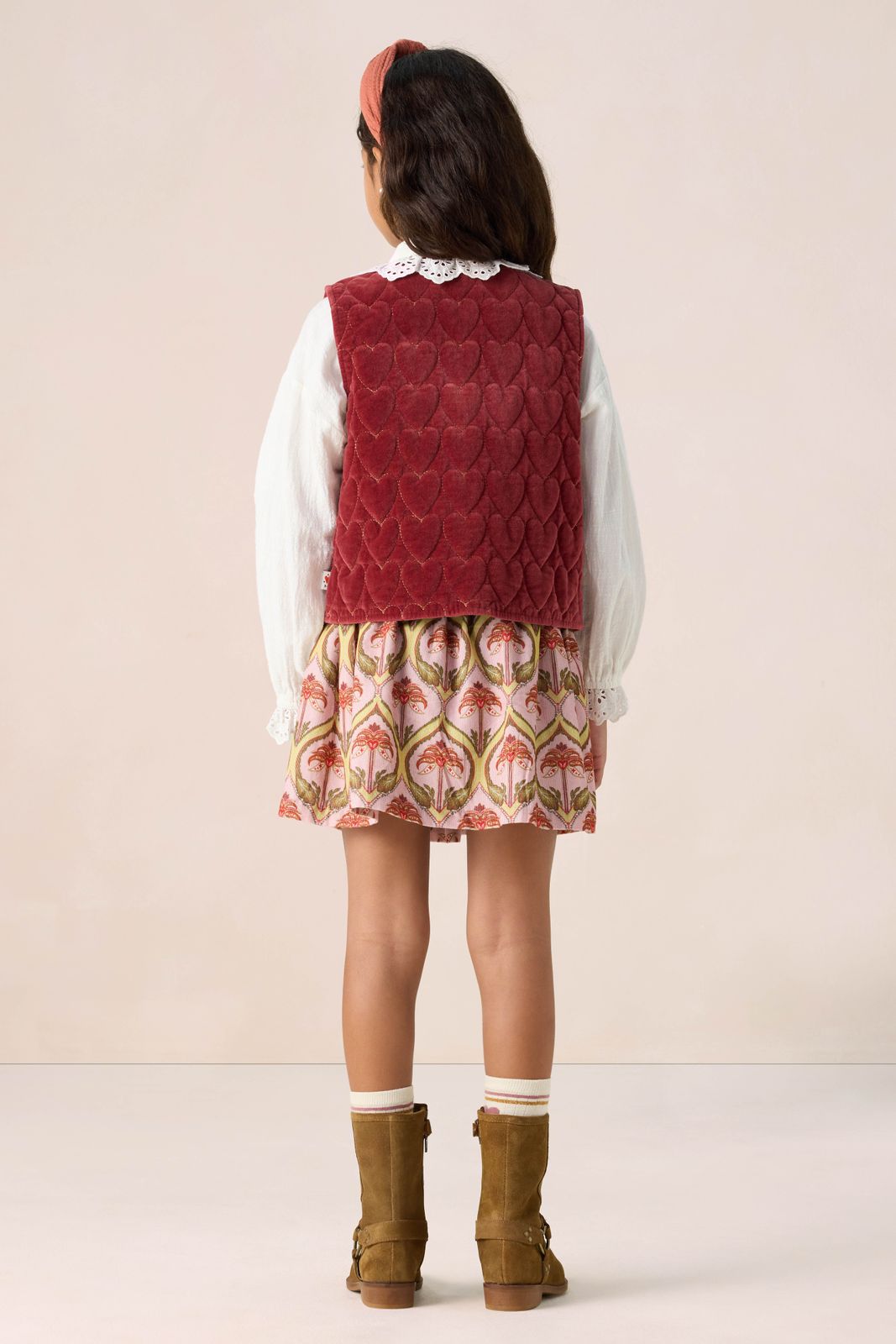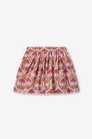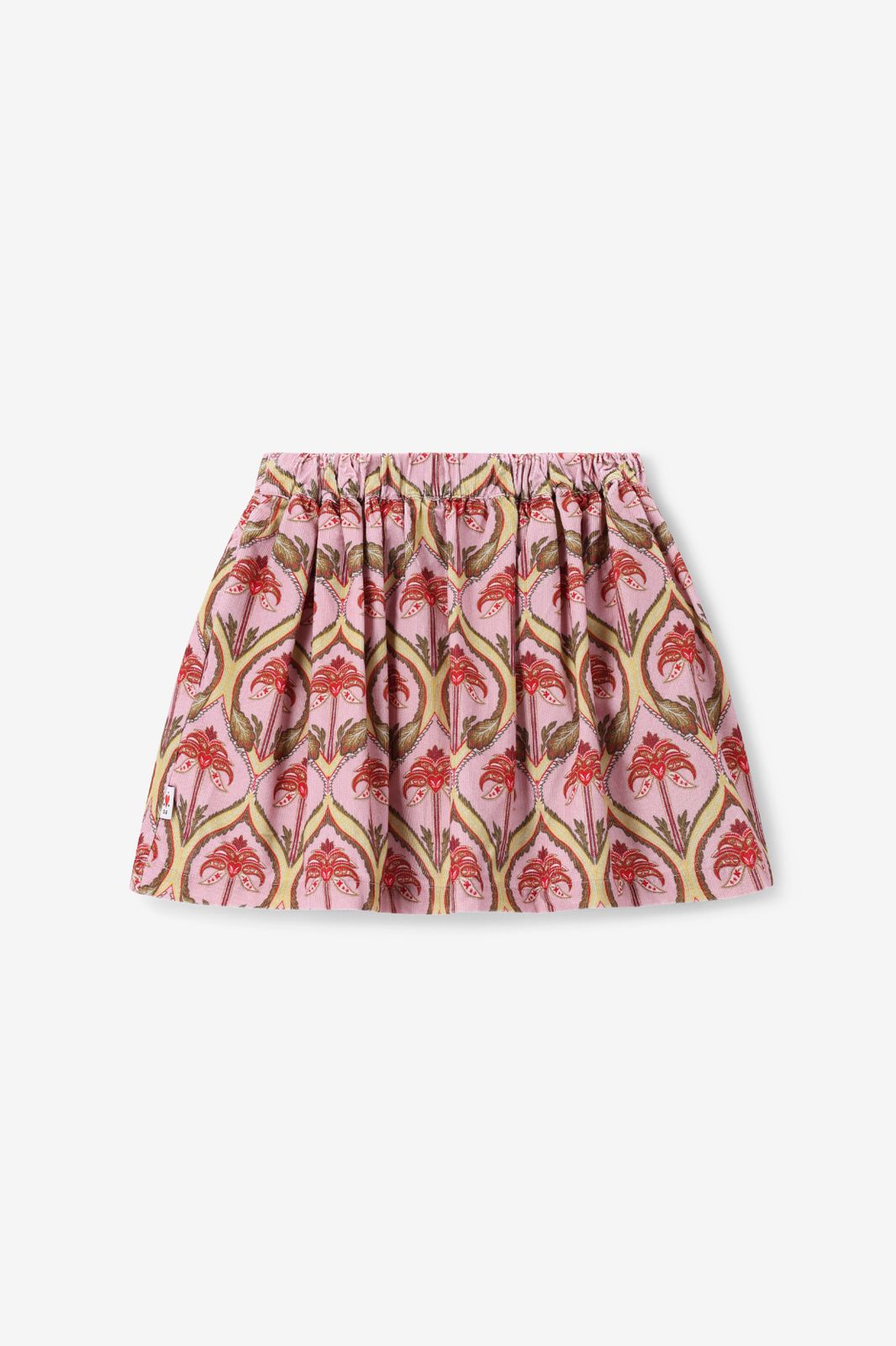 Jupe rose de Sissy-Boy. La jupe courte en velours côtelé a une taille haute et une bande élastique à la taille. La jupe est également dotée d'un imprimé palmiers avec des détails rouges et verts. Composition : 100% coton.