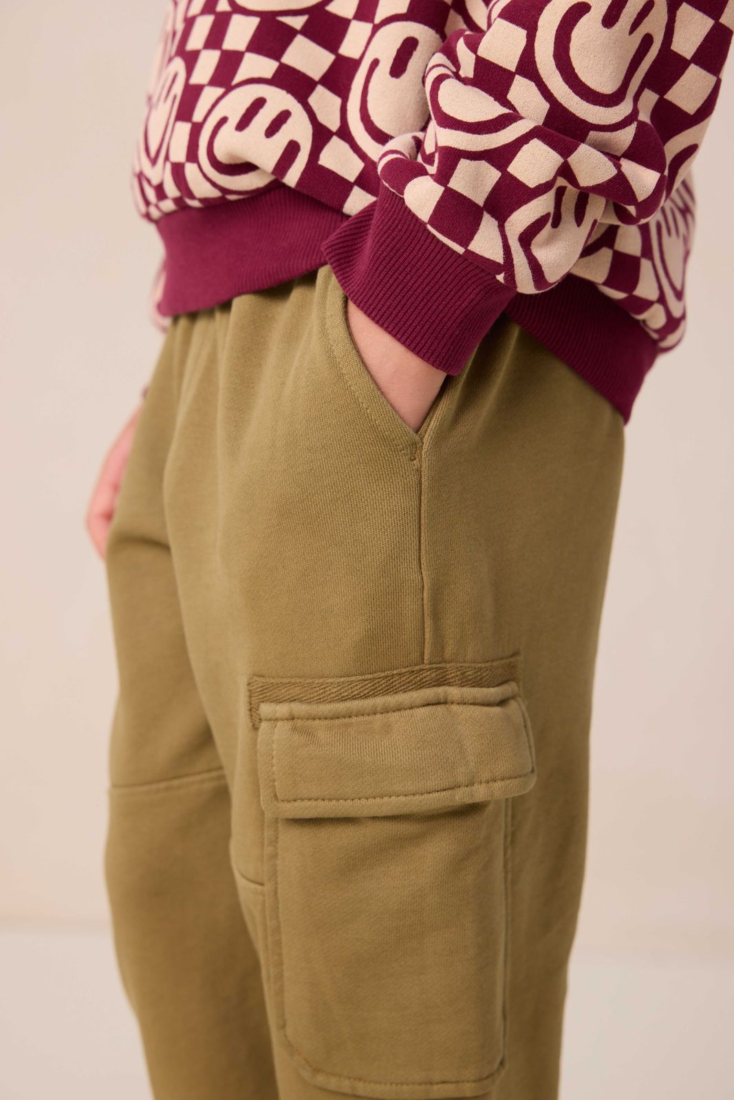 Pantalon cargo pull-on vert foncé de Sissy-Boy. Le pantalon a une bande élastique avec cordons de serrage, des poches latérales, des poches à l'arrière et deux poches plaquées sur les côtés. Composition : 100% coton.