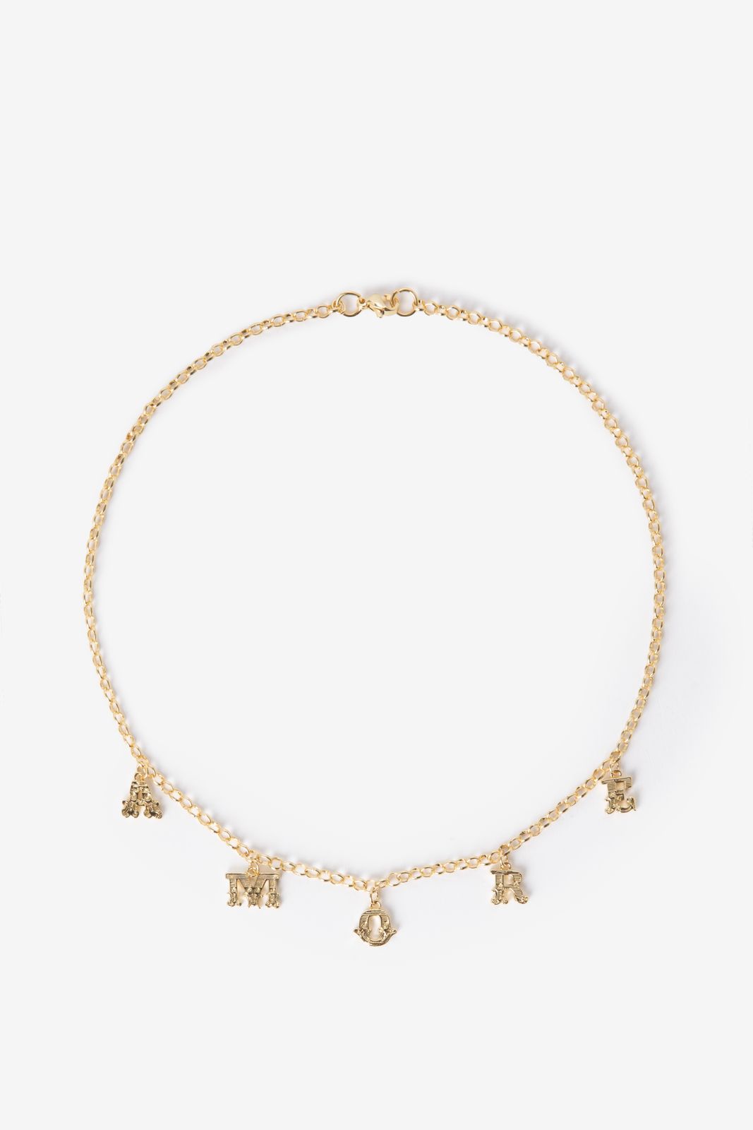 Collier ras du cou plaqué or de la marque Anna+Nina. Le collier de couleur dorée est orné des lettres du mot 'Amore' séparées les unes des autres. Dimensions : 210x210x2 mm. Matériau : laiton plaqué or.