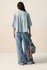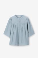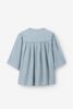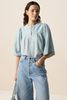 Blouse bleue avec manches bouffantes de Sissy-Boy. La blouse a des manches trois-quarts, un col montant, une fermeture boutonnée et une coupe régulière. Composition : 52% viscose, 48% coton.