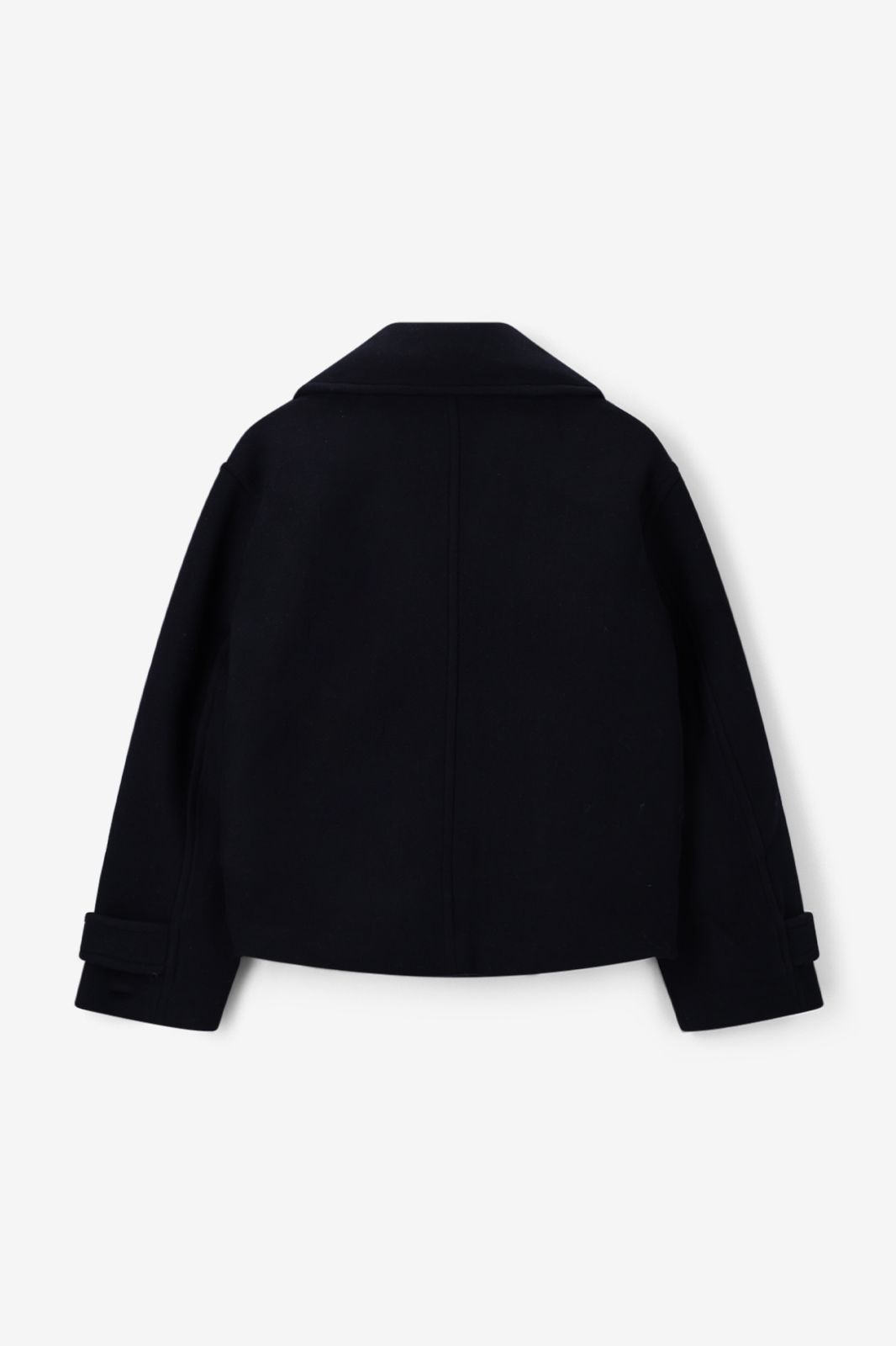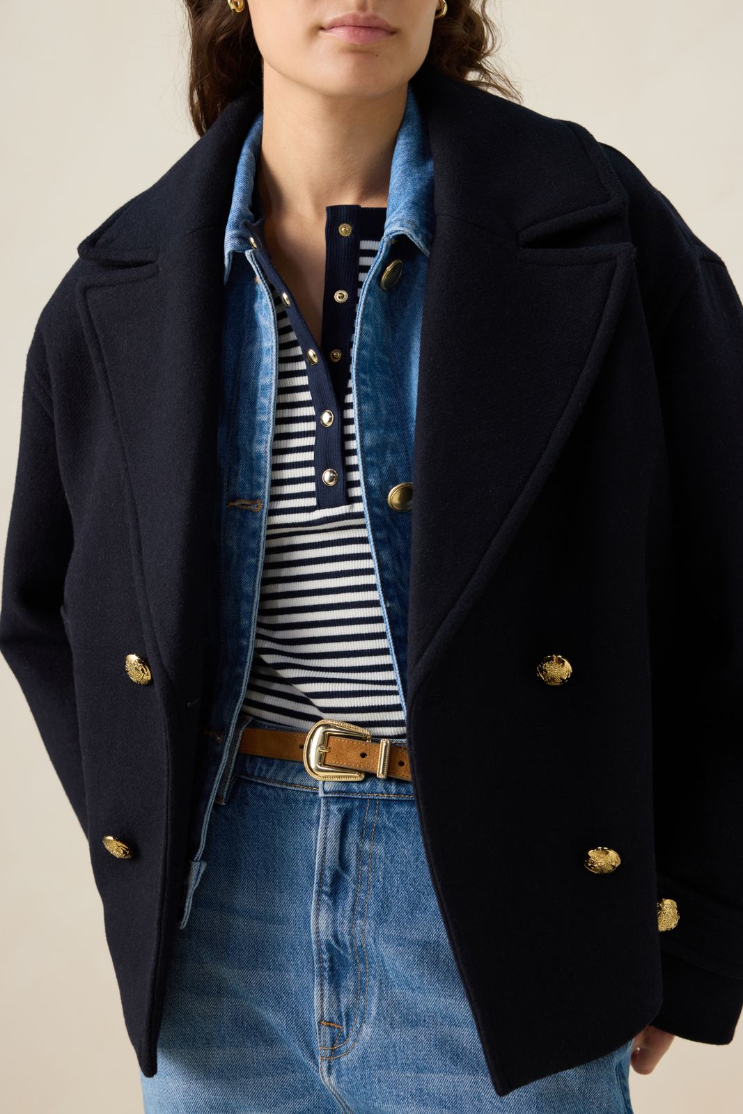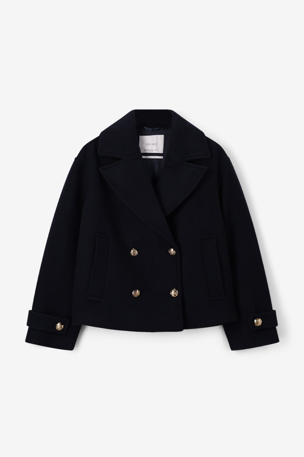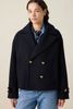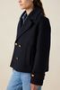 Caban bleu foncé de Sissy-Boy. Ce manteau court en laine a des manches longues, un grand col, des poches plaquées et une fermeture boutonnée dorée. Le manteau a un style caban classique. Le mannequin mesure 1,74 m et porte une taille XS-S. Composition : 45% laine, 55% polyester.
