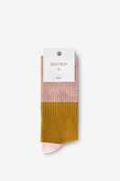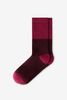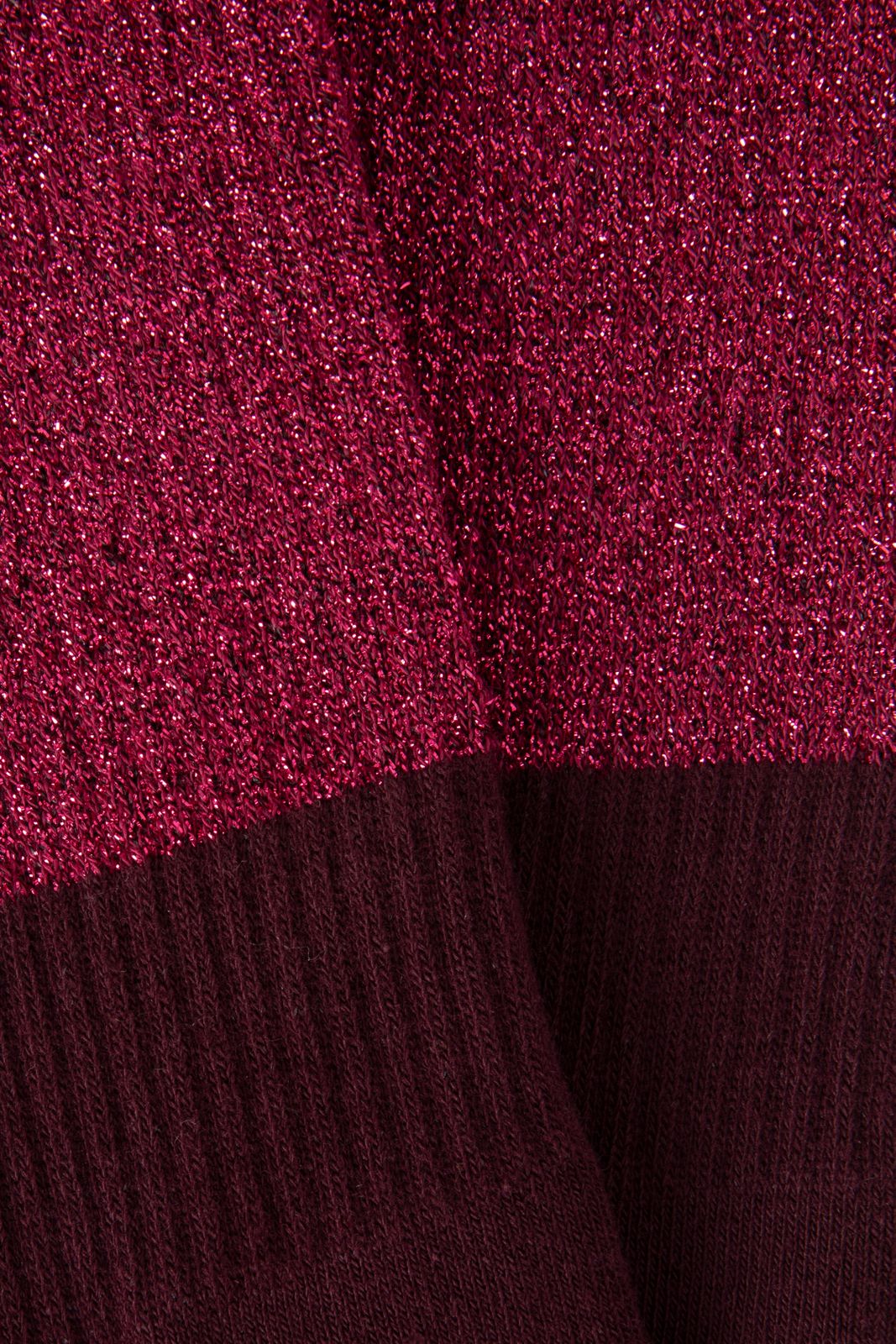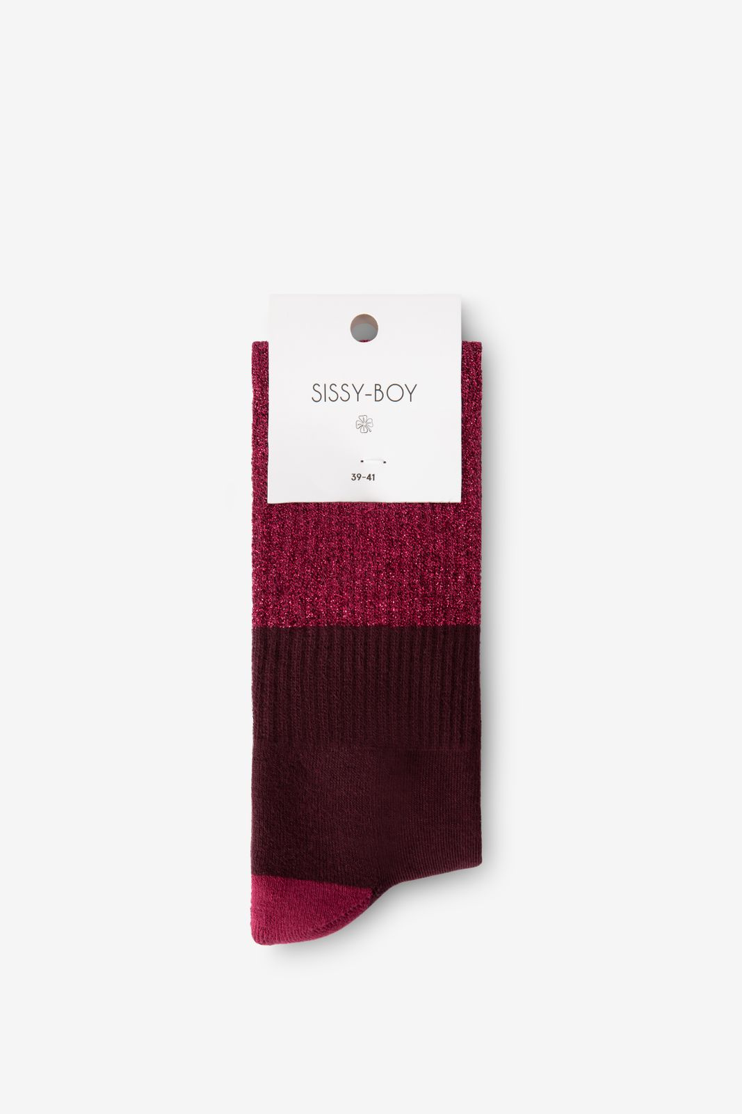Chaussettes rouge foncé de Sissy-Boy. Les chaussettes ont une texture côtelée et sont dotées de fil lurex doré. Composition : 76% coton, 21% polyamide, 3% élasthane.