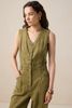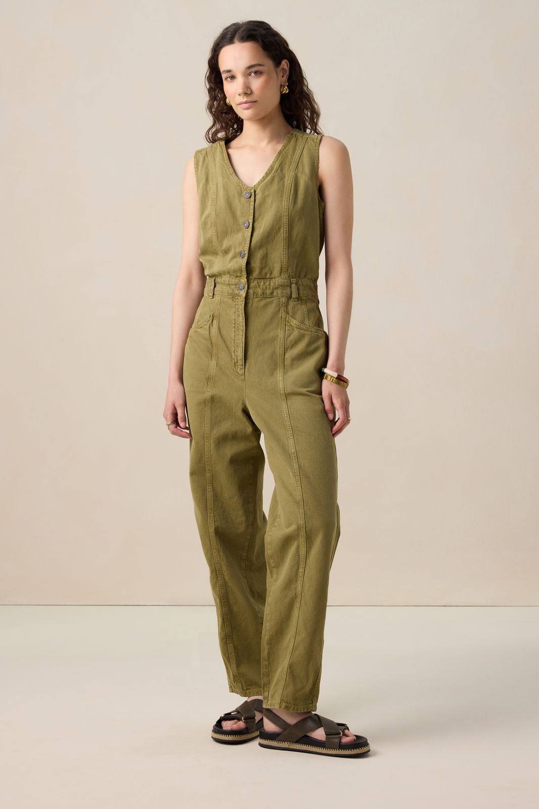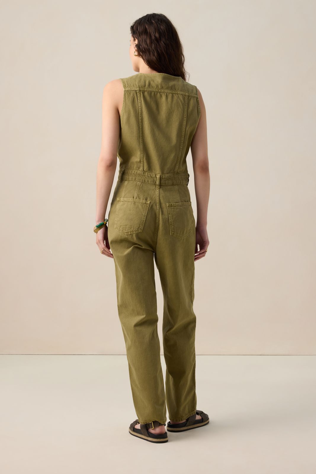 Combinaison sans manches verte de Sissy-Boy. Cette combinaison a un col V, une ceinture, des jambes larges et se ferme avec un bouton et une fermeture éclair. La combinaison a également deux poches latérales et deux poches plaquées à l'arrière. Composition : 100% coton.