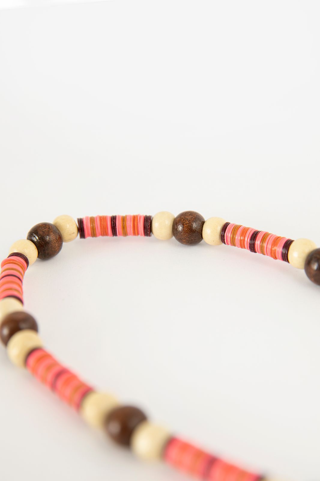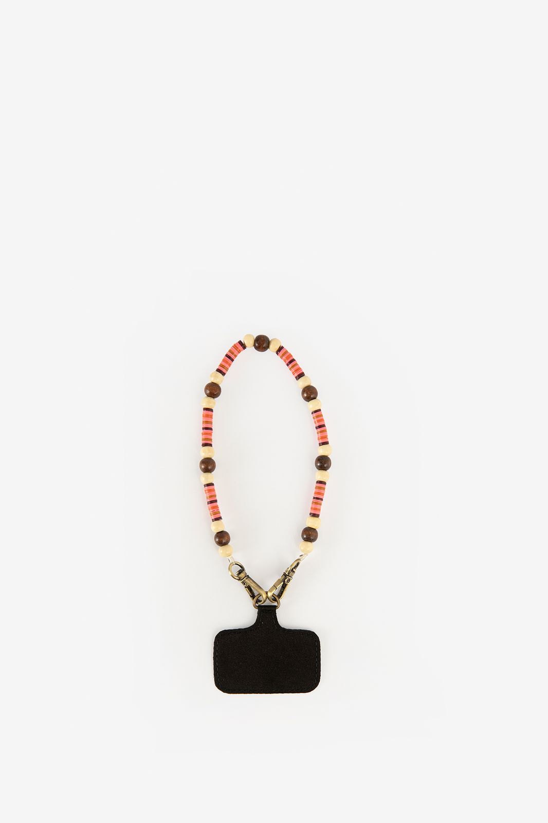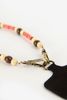 Cordon téléphone rose avec perles multicolores de Sissy-Boy. Le cordon dispose d'une languette qui peut être glissée dans une coque de téléphone. Le cordon a une longueur de 120 cm. Composition : 45% bois, 45% plastique, 10% fer.