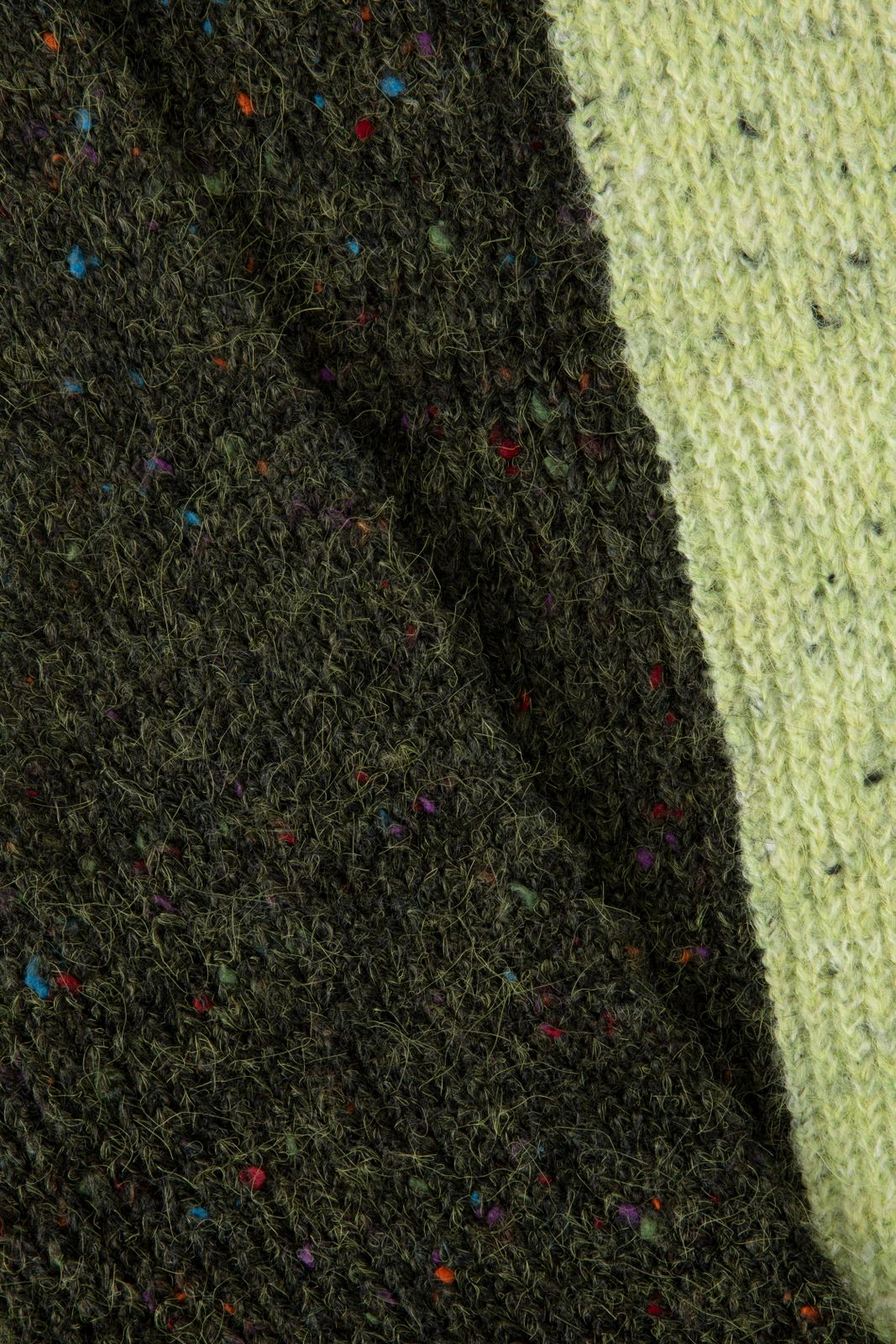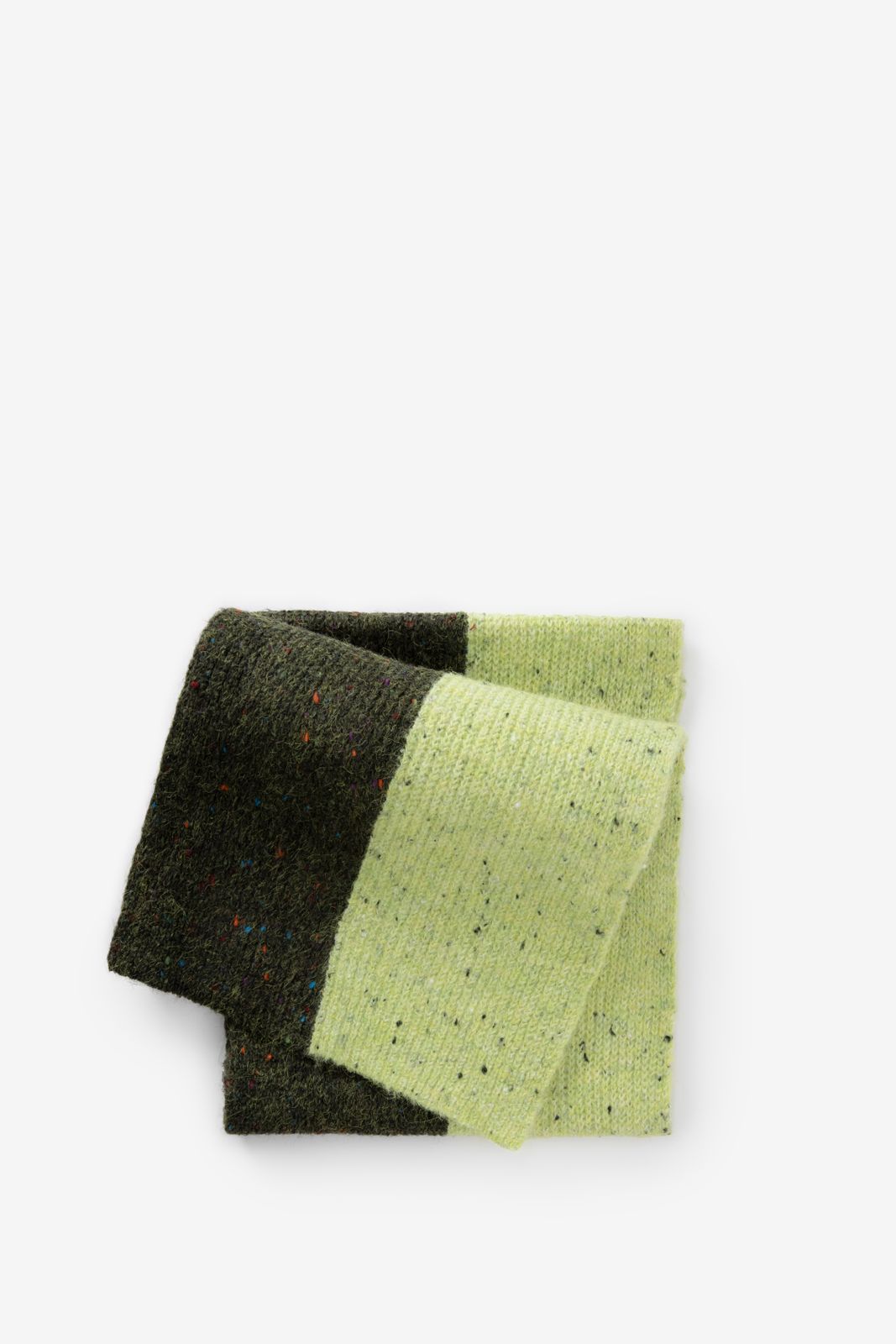 Écharpe color block de Sissy-Boy. L'écharpe a un motif color block vert clair et vert foncé avec des petits points colorés tissés. Dimensions : 145x29 cm. Composition : 68% polyester, 23% acrylique, 7% laine, 2% élasthane.