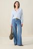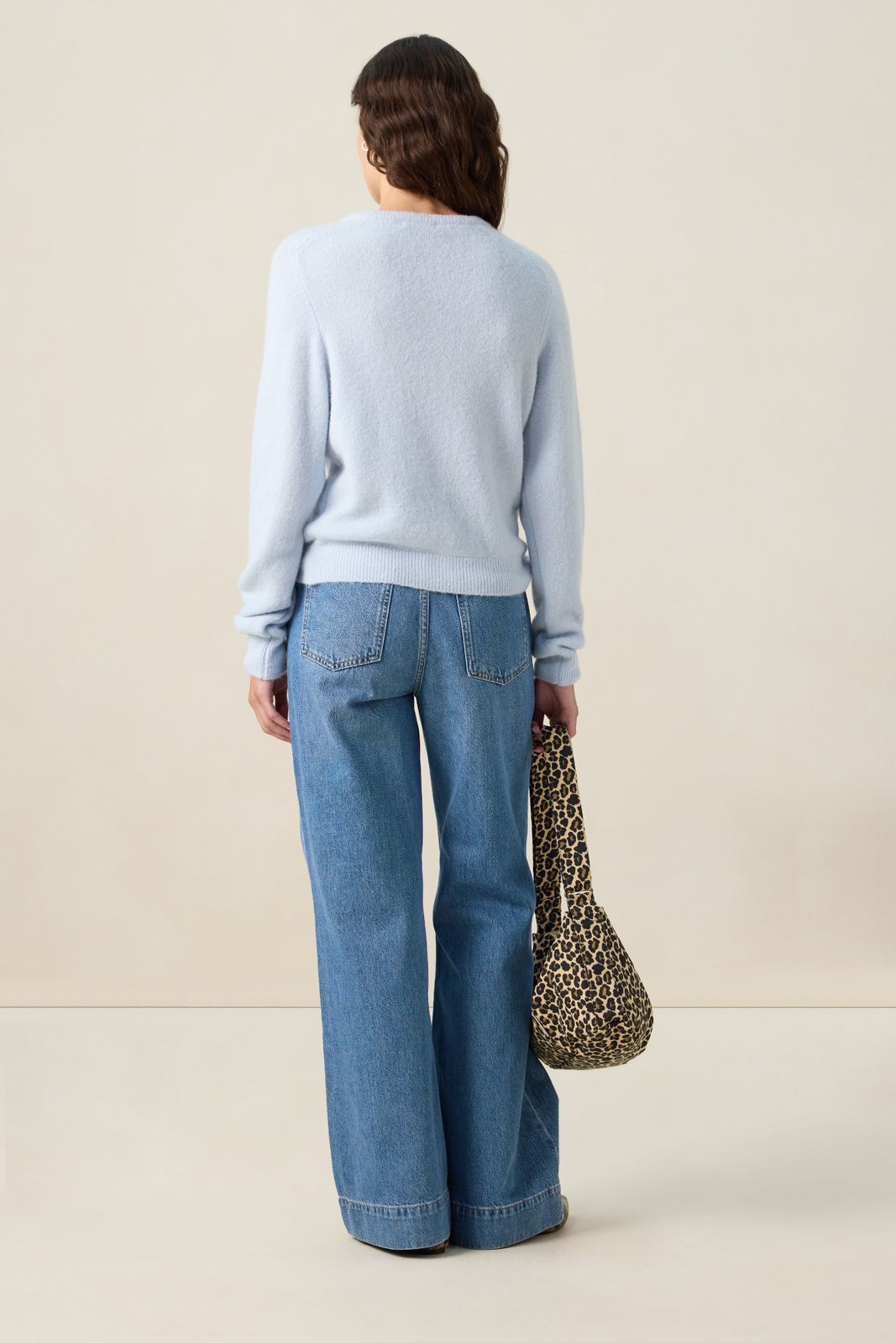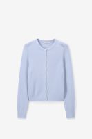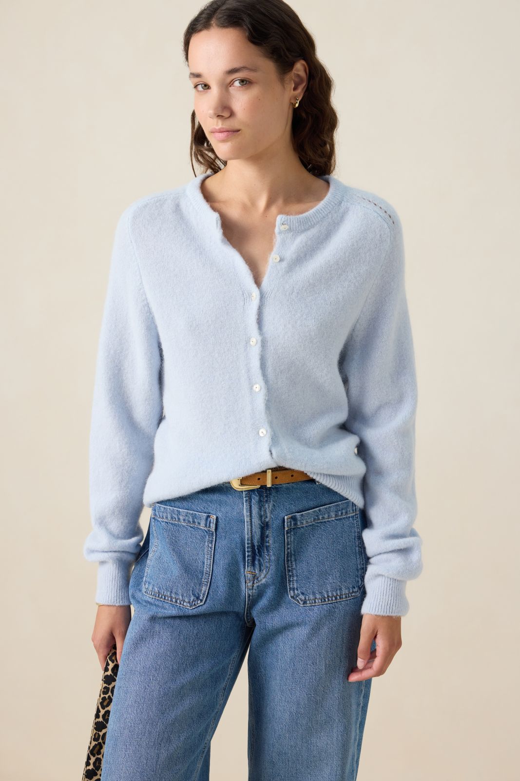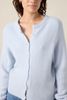 Gilet bleu clair de Sissy-Boy. Le gilet en maille fine a des manches longues, un col rond, une fermeture boutonn\u00e9e et une coupe r\u00e9guli\u00e8re. Le mannequin mesure 1,74 m et porte une taille S. Composition : 42% polyamide, 26% acrylique, 14% laine d'alpaga, 14% laine, 4% \u00e9lasthane.
