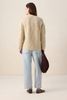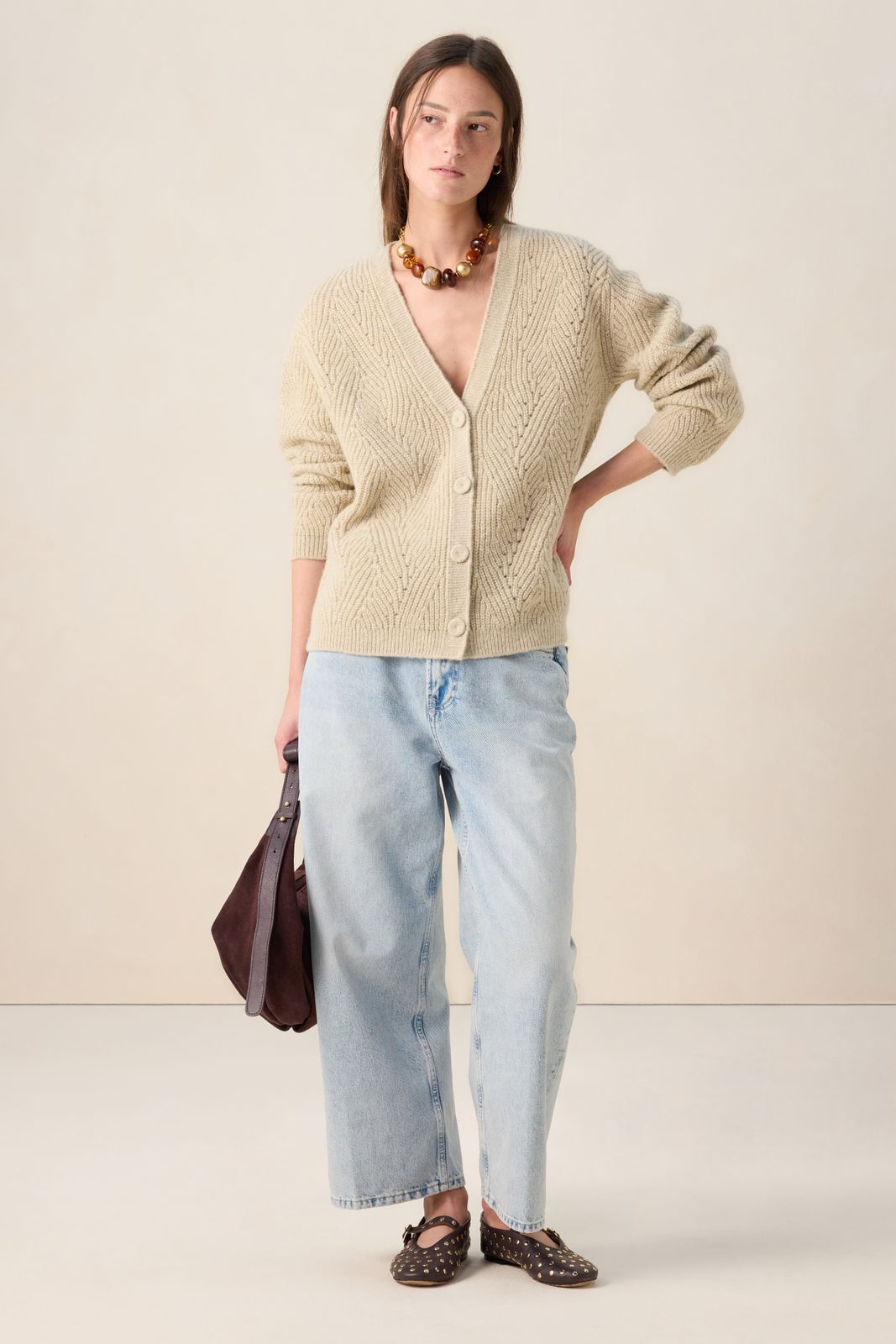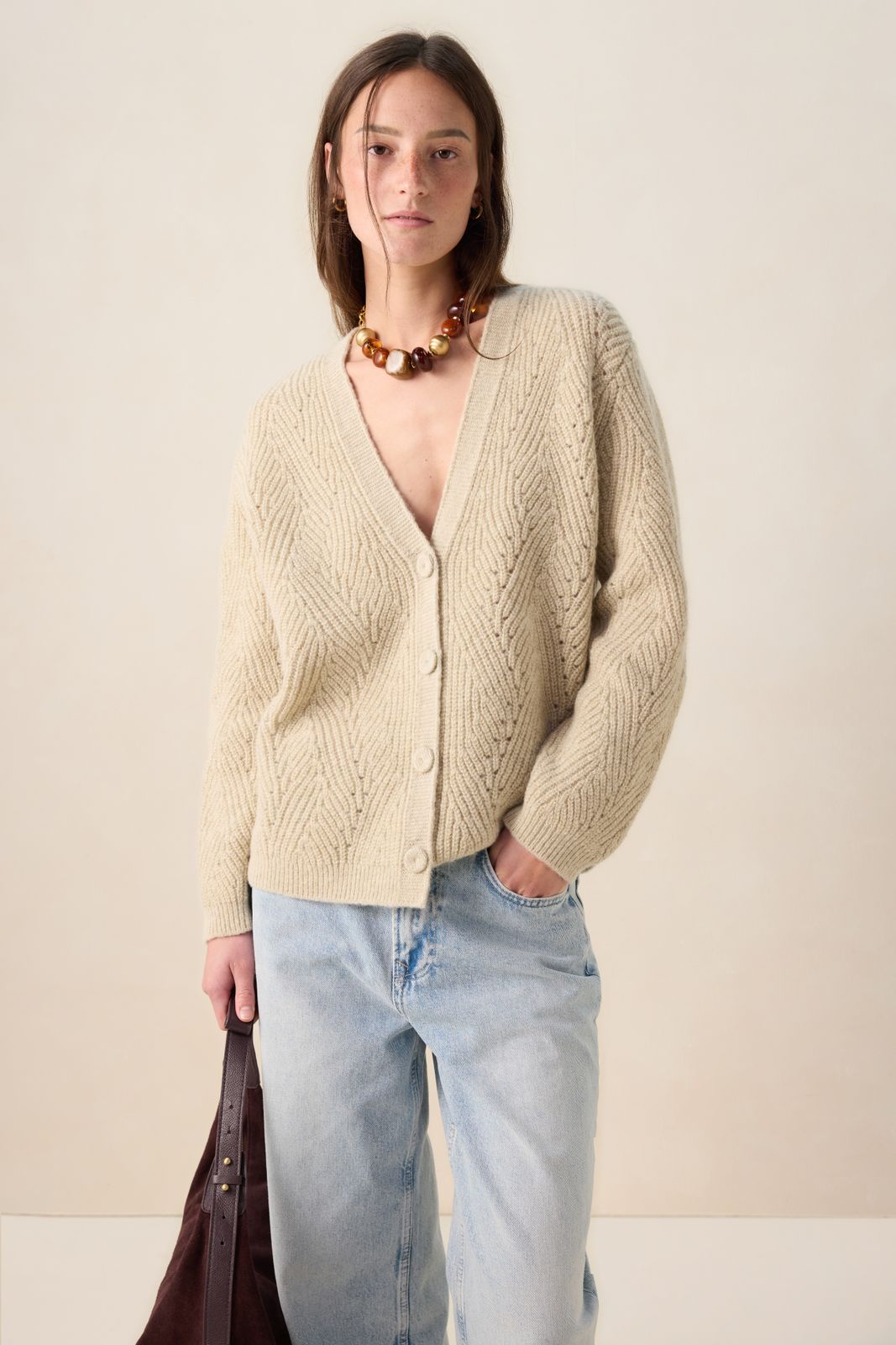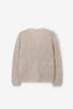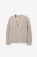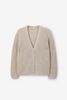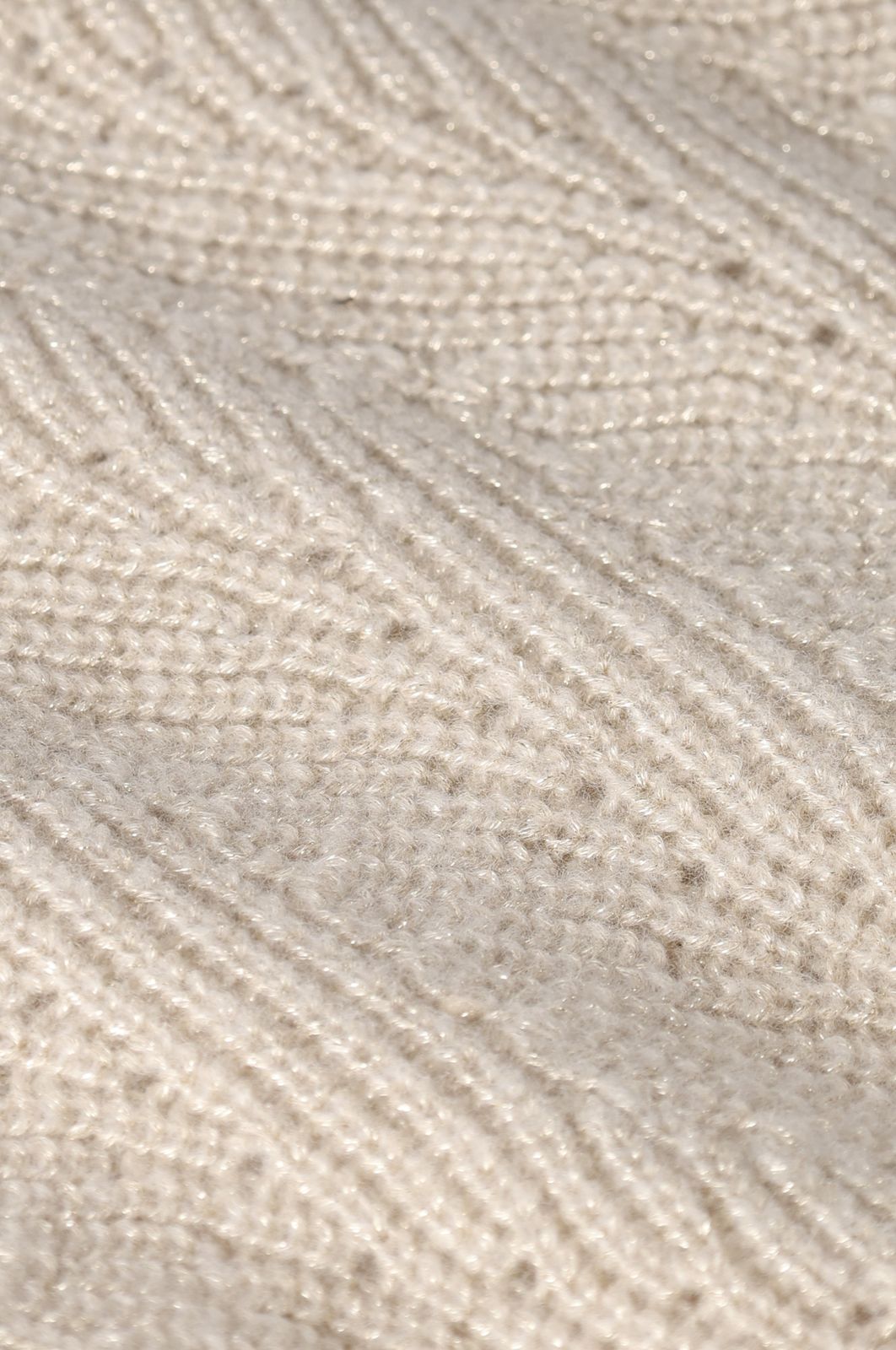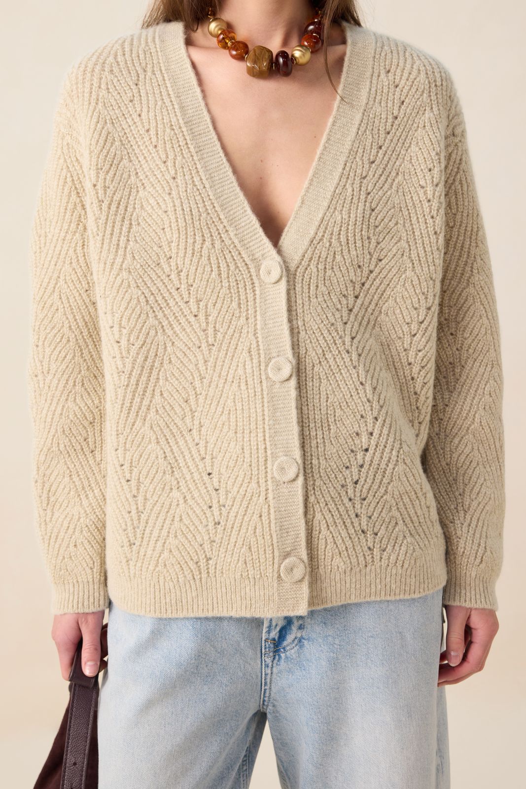 Gilet grosse maille blanc de Sissy-Boy. Le gilet a des manches longues avec épaules basses, des bords côtelés, une fermeture boutonnée, un col V et une coupe décontractée. Le gilet est également doté d'un motif à chevrons avec des détails pailletés dorés en lurex. Composition : 59% laine, 25% polyester, 16% fil métallique.