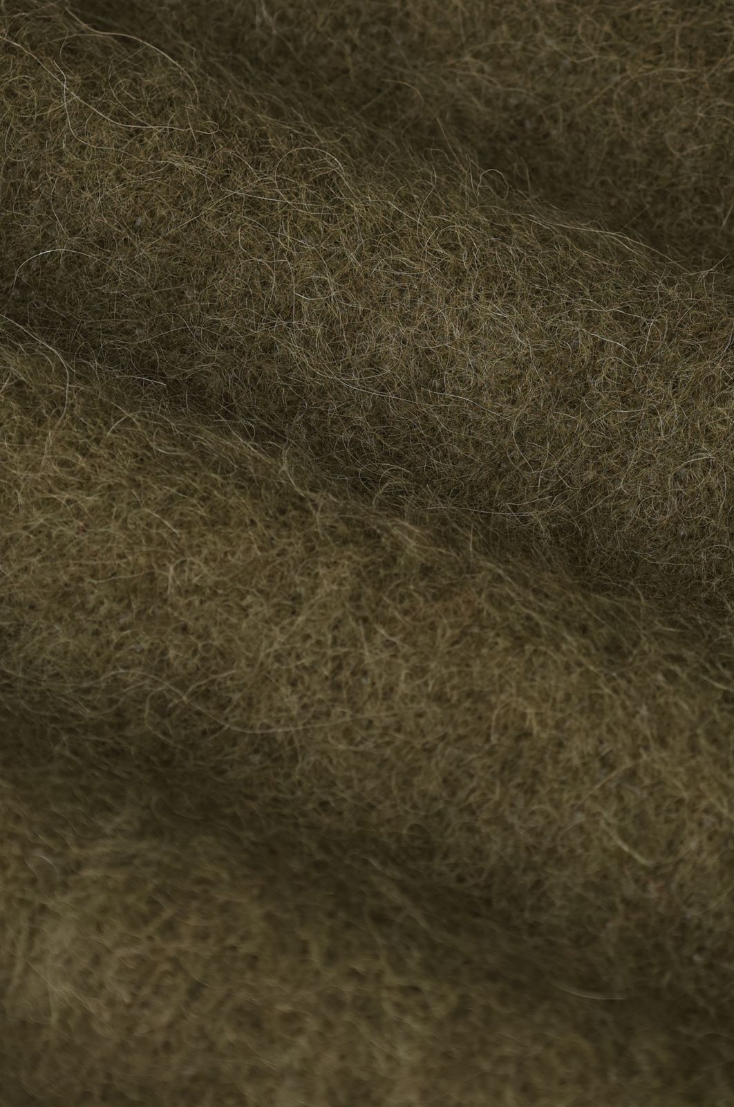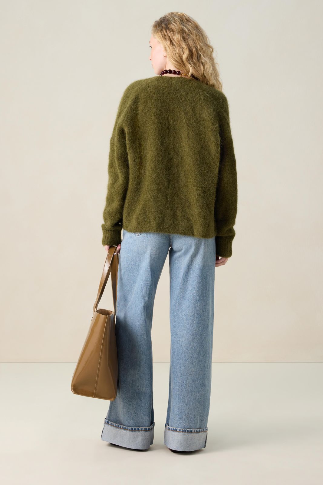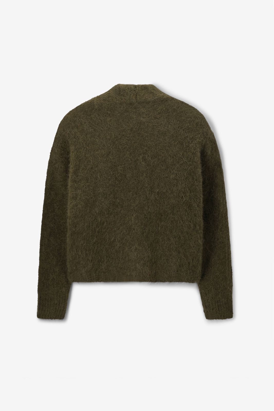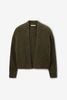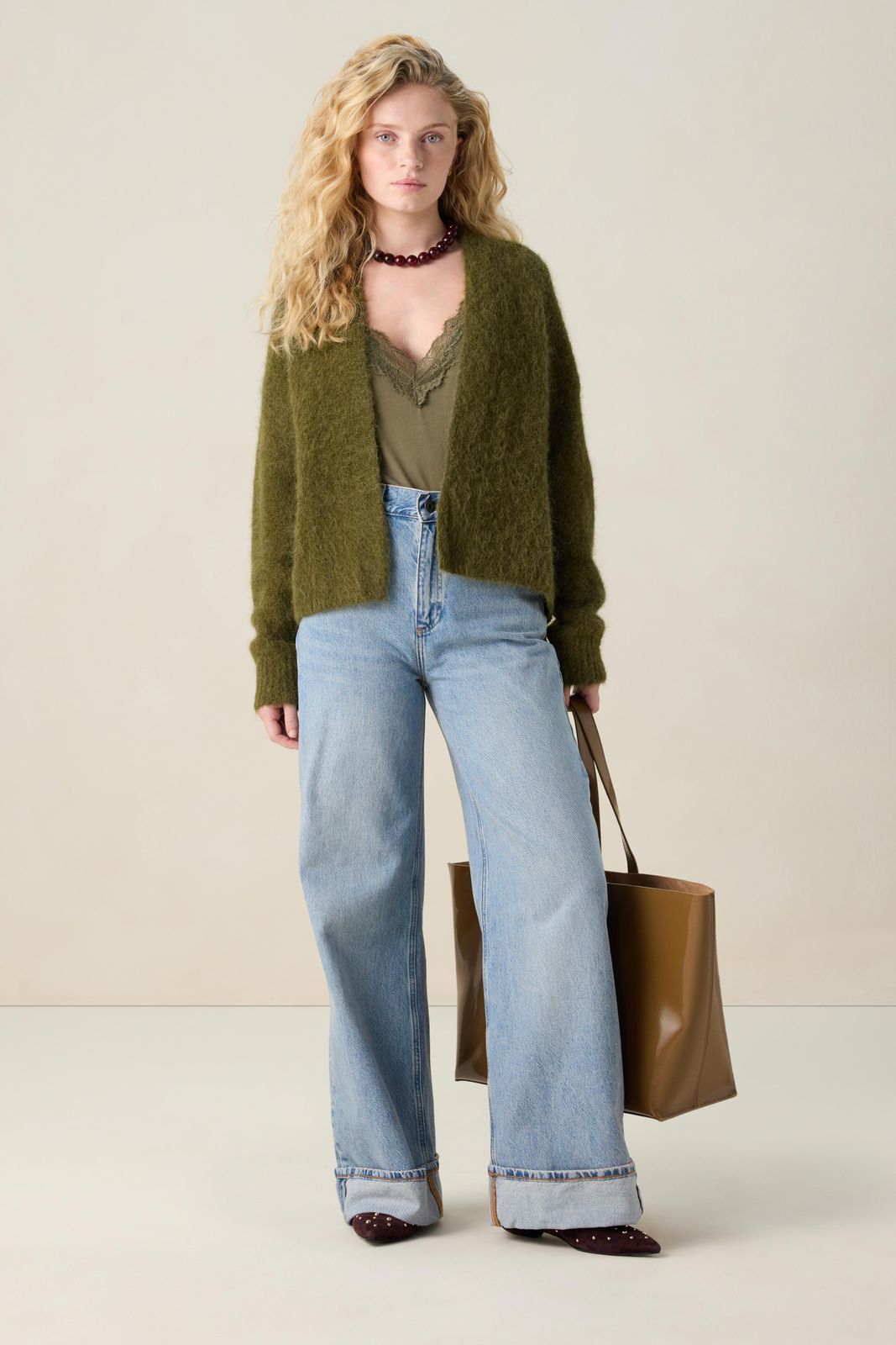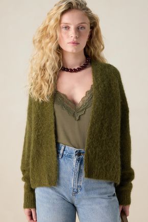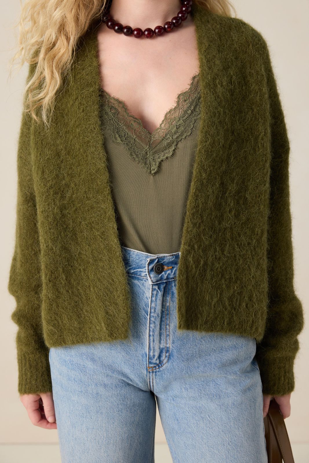 Gilet tricoté vert foncé de Sissy-Boy. Le gilet a des manches longues avec épaules basses, des bords côtelés et une coupe décontractée. Le gilet est en laine et n'a pas de fermeture. Le mannequin mesure 1,71 m et porte une taille S. Composition : 78% laine d'alpaga, 19% polyamide, 3% élasthane.