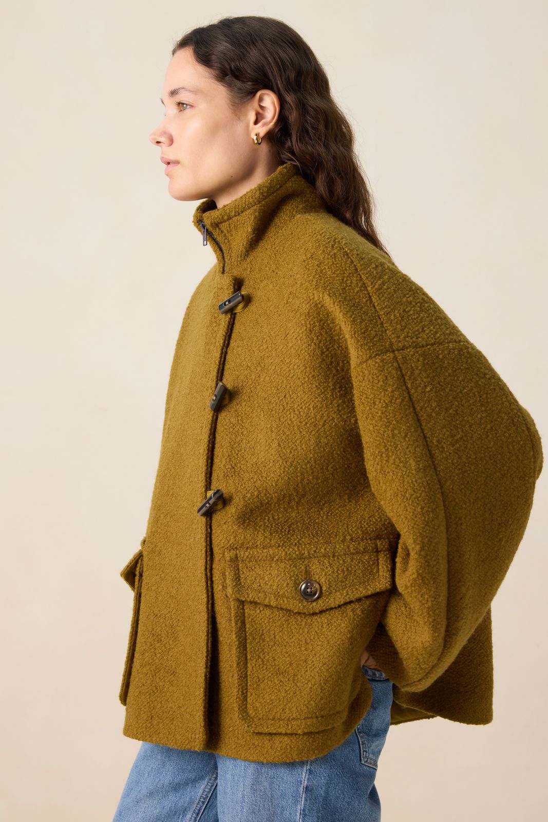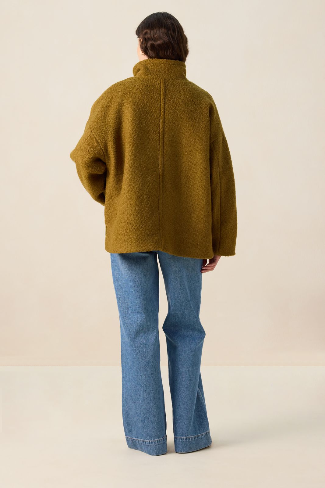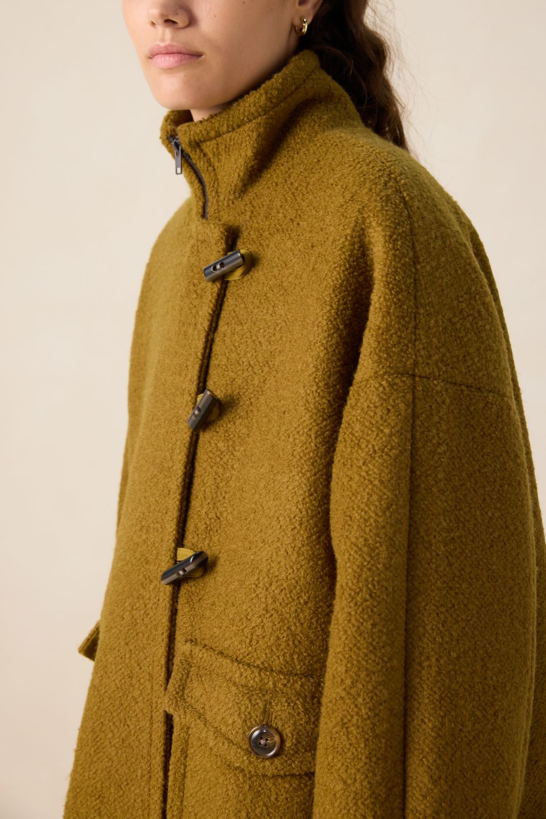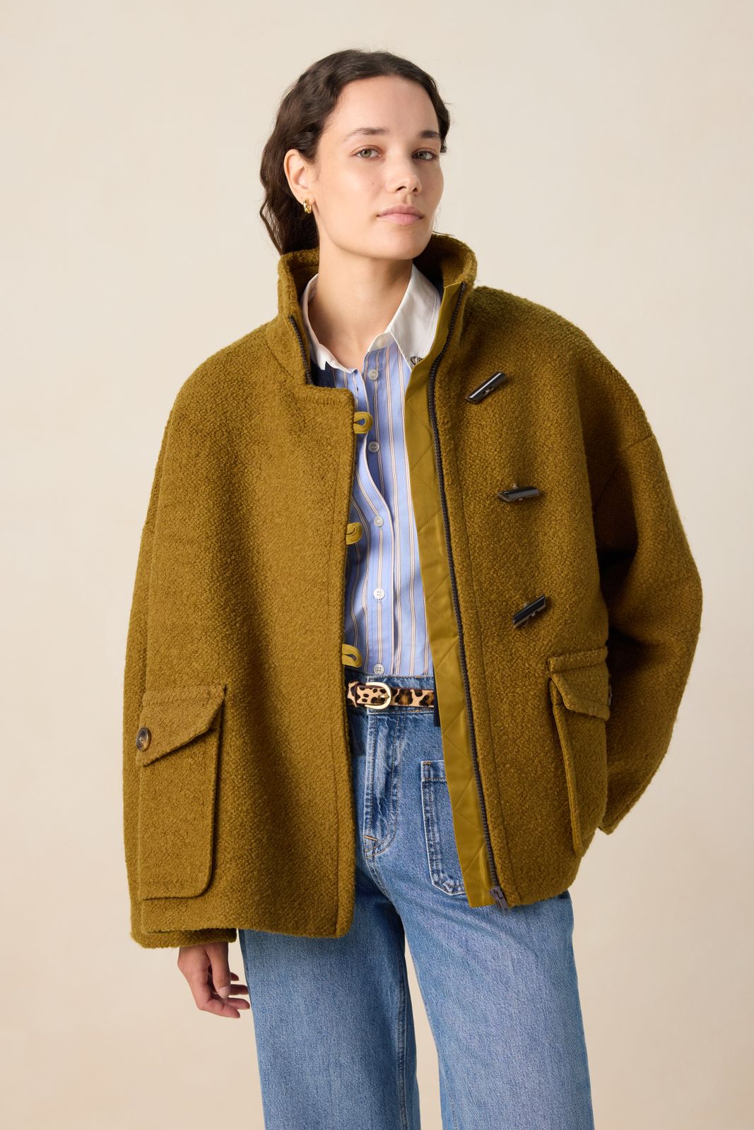 Manteau vert foncé de Sissy-Boy. Ce manteau court a des manches longues, un col montant, des poches plaquées et se ferme avec un bouton et une fermeture éclair. Le manteau est en tissu bouclette texturé. Composition : 45% laine, 55% polyester.