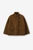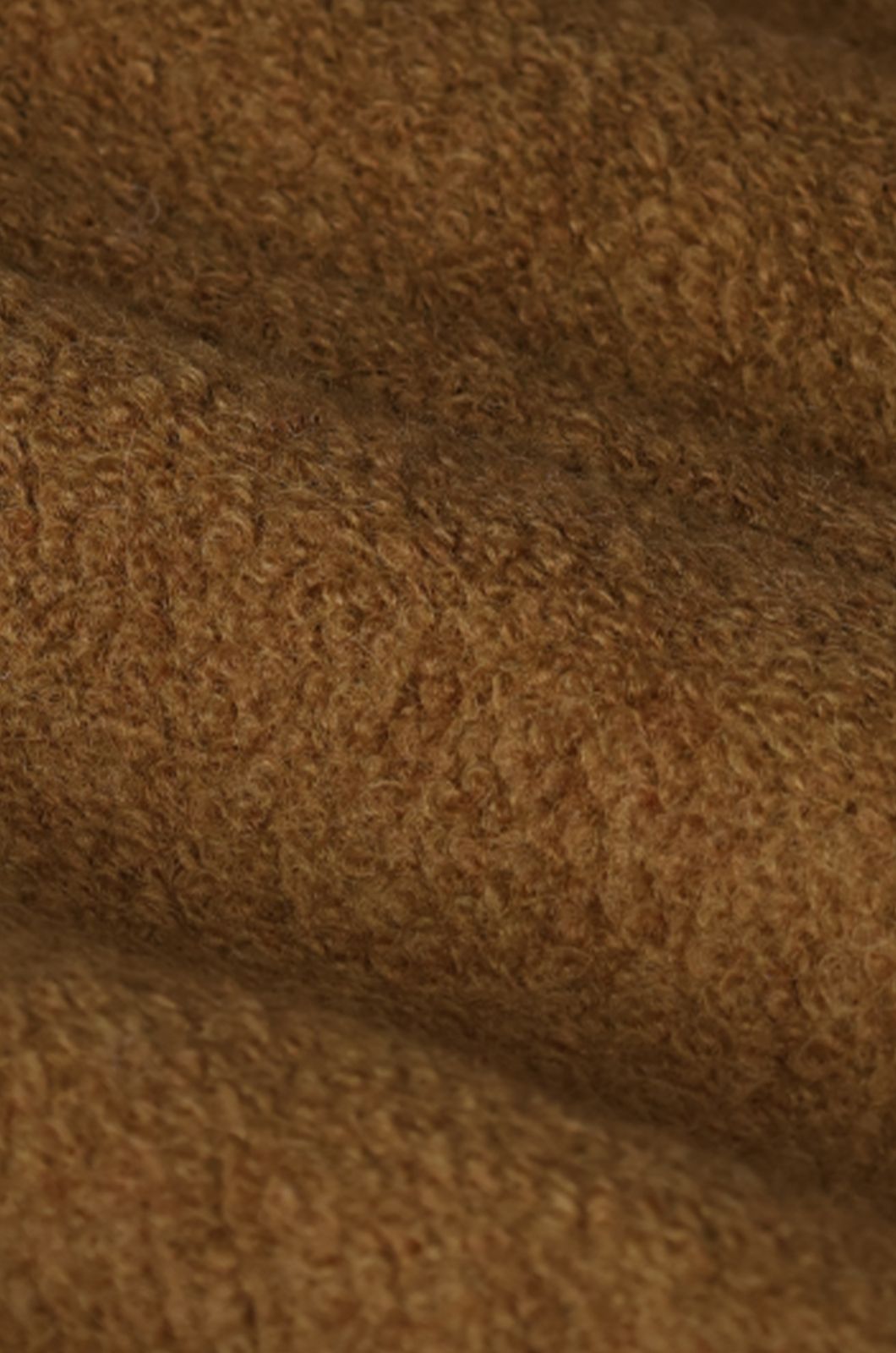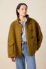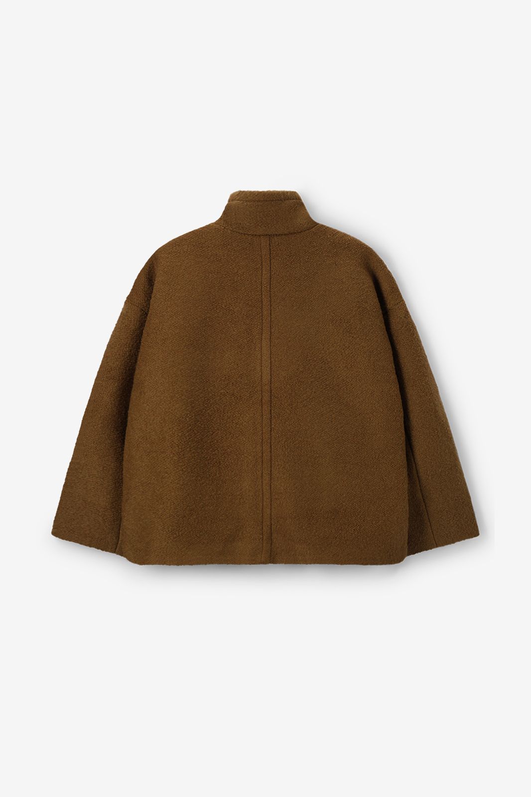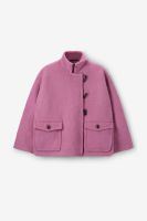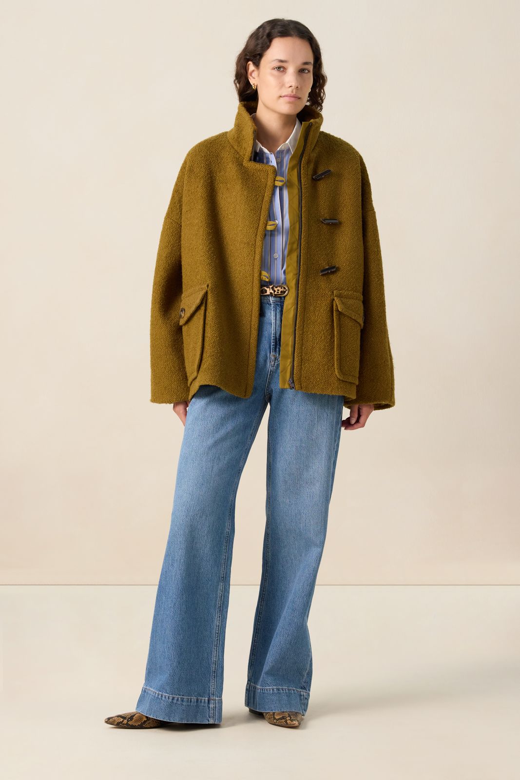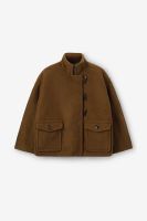 Manteau vert foncé de Sissy-Boy. Ce manteau court a des manches longues, un col montant, des poches plaquées et se ferme avec un bouton et une fermeture éclair. Le manteau est en tissu bouclette texturé. Composition : 45% laine, 55% polyester.