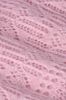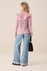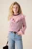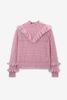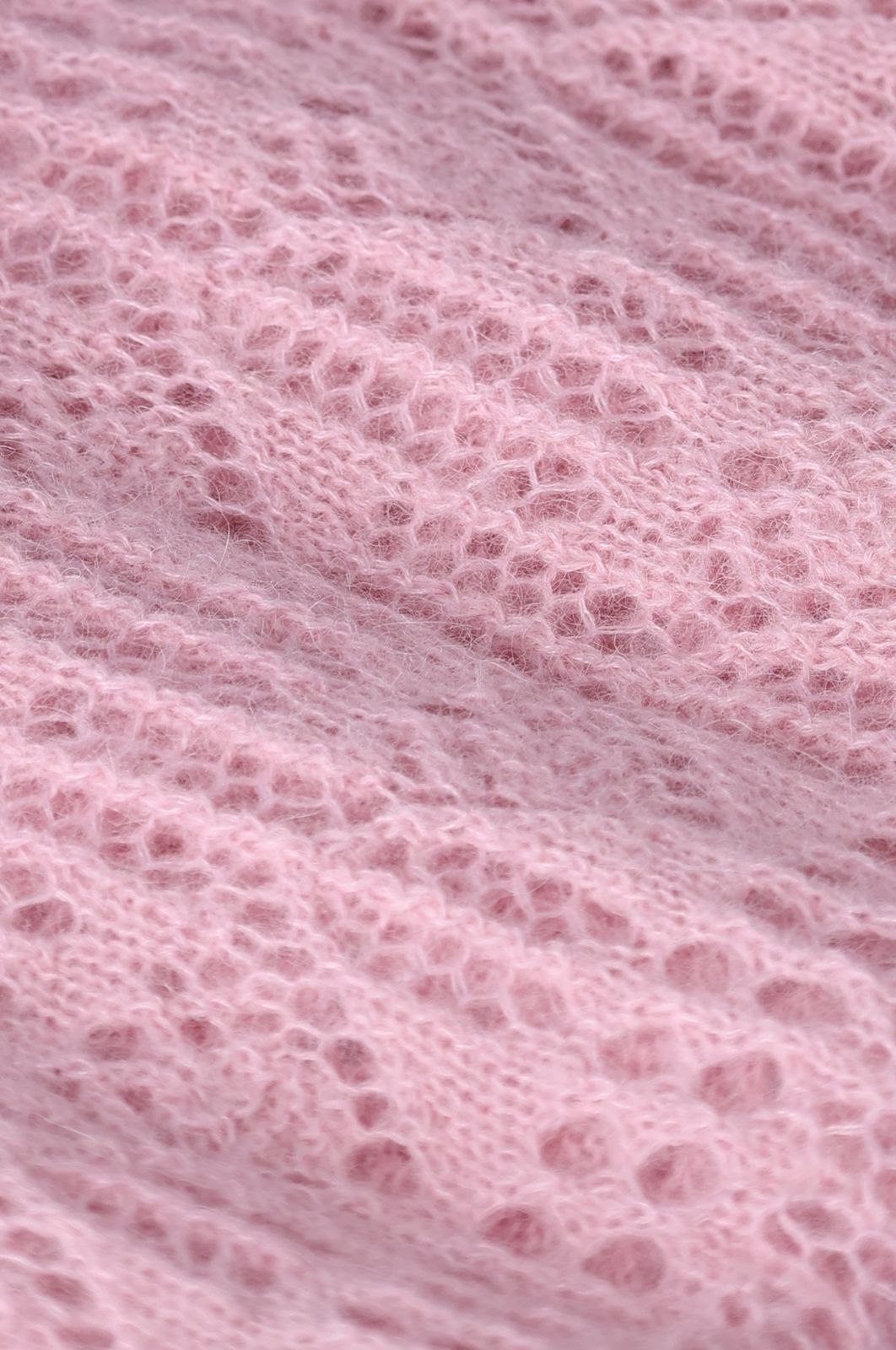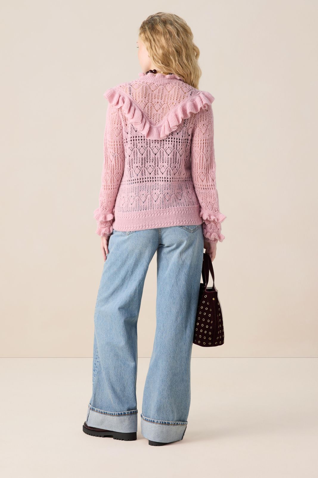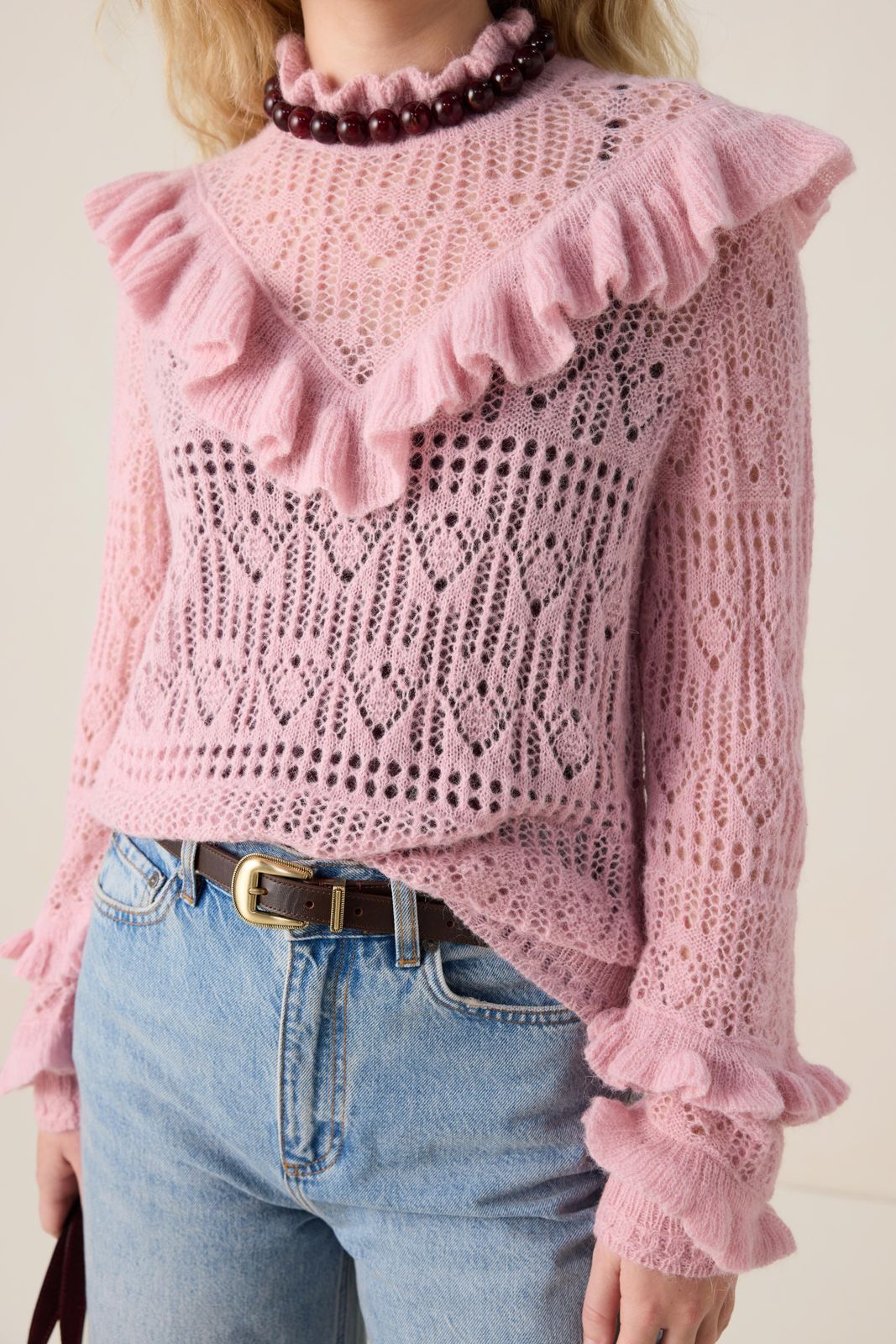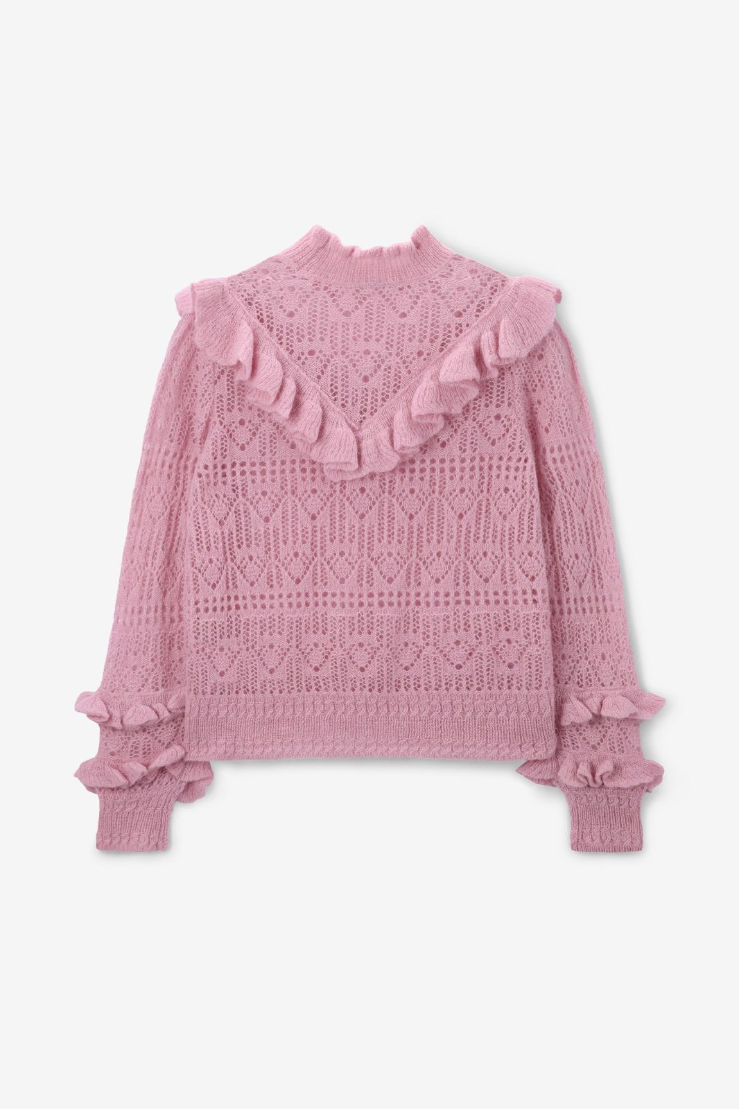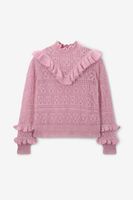 Pull rose de Sissy-Boy. Le pull a des manches longues, un col rond montant, des volants et une coupe régulière. Le pull a un motif ajouré. Composition : 41% nylon, 38% laine d'alpaga, 21% laine.