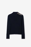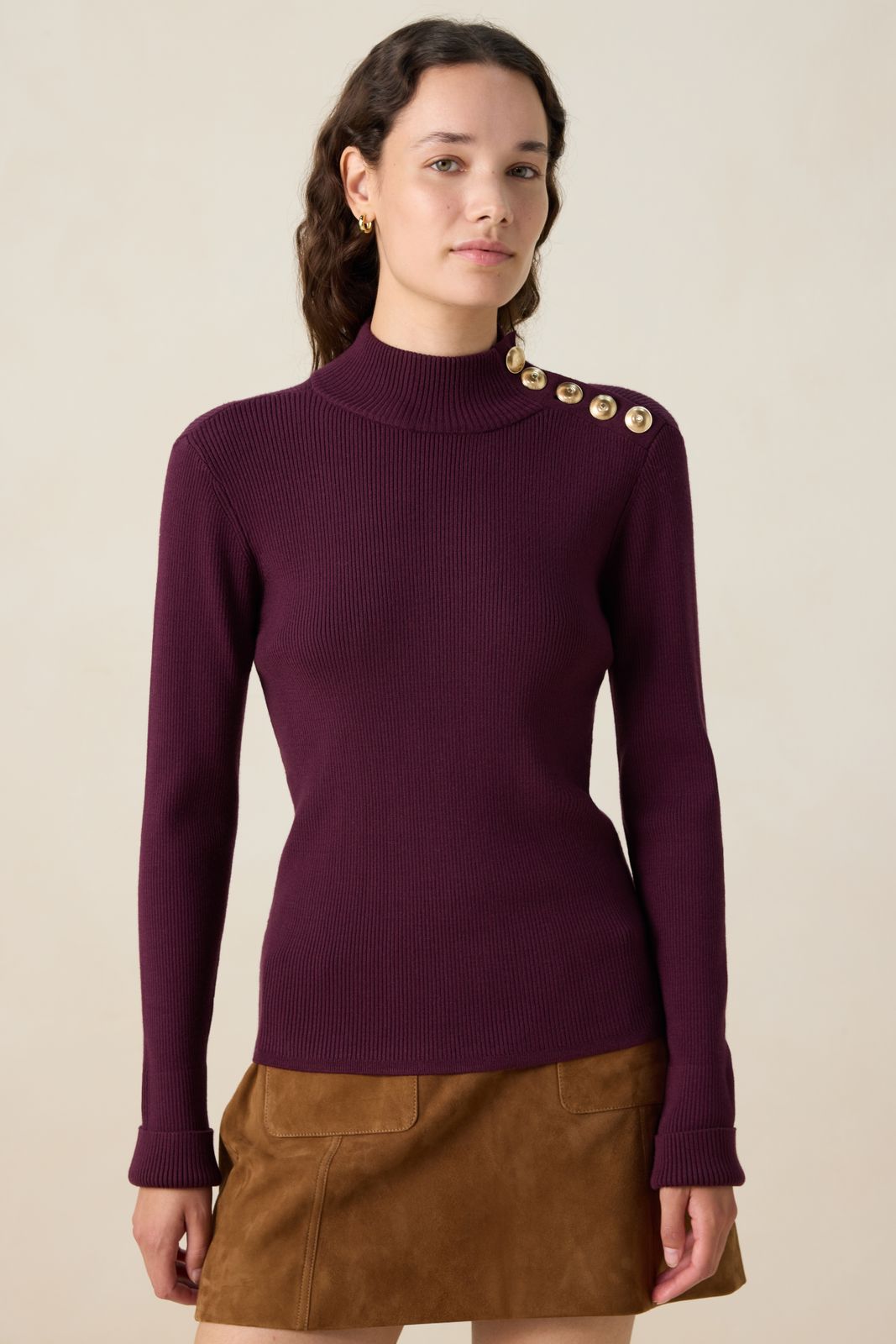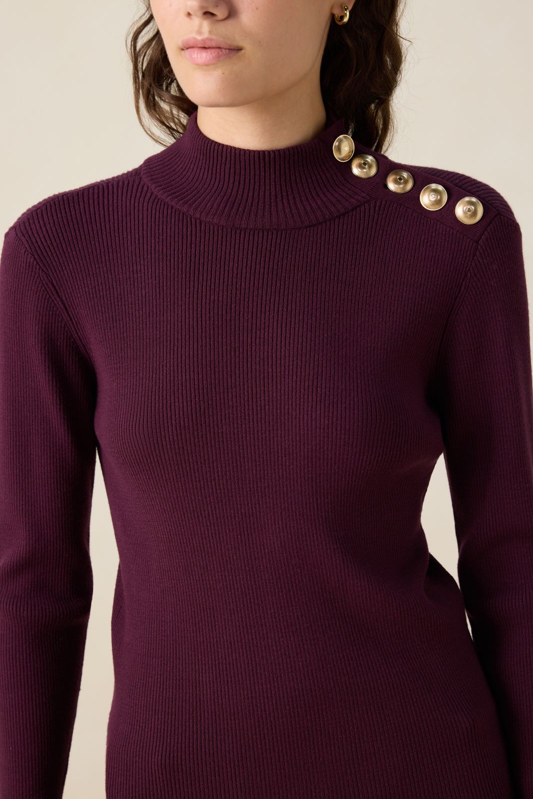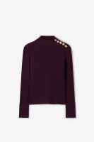 Pull rouge foncé de Sissy-Boy. Le pull a des manches longues, un col montant et une coupe ajustée. Le pull est également doté de boutons dorés sur une épaule. Composition : 67% viscose, 33% polyester.