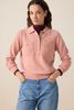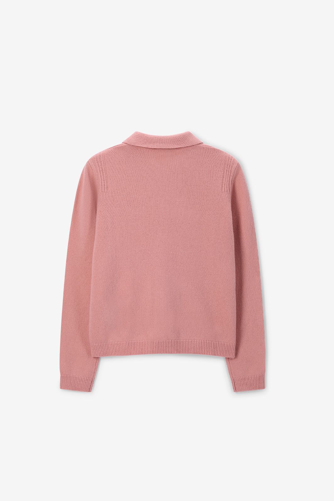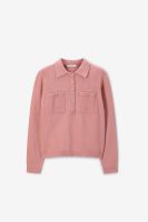 Pull rose de Sissy-Boy. Le pull a des manches longues, un col polo, une fermeture boutonnée, deux poches poitrine et une coupe régulière. Le pull couleur vieux rose a également des boutons dorés. Composition : 100% laine mérinos.