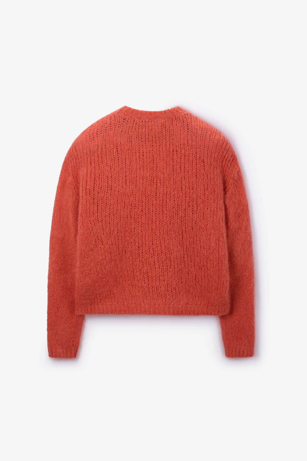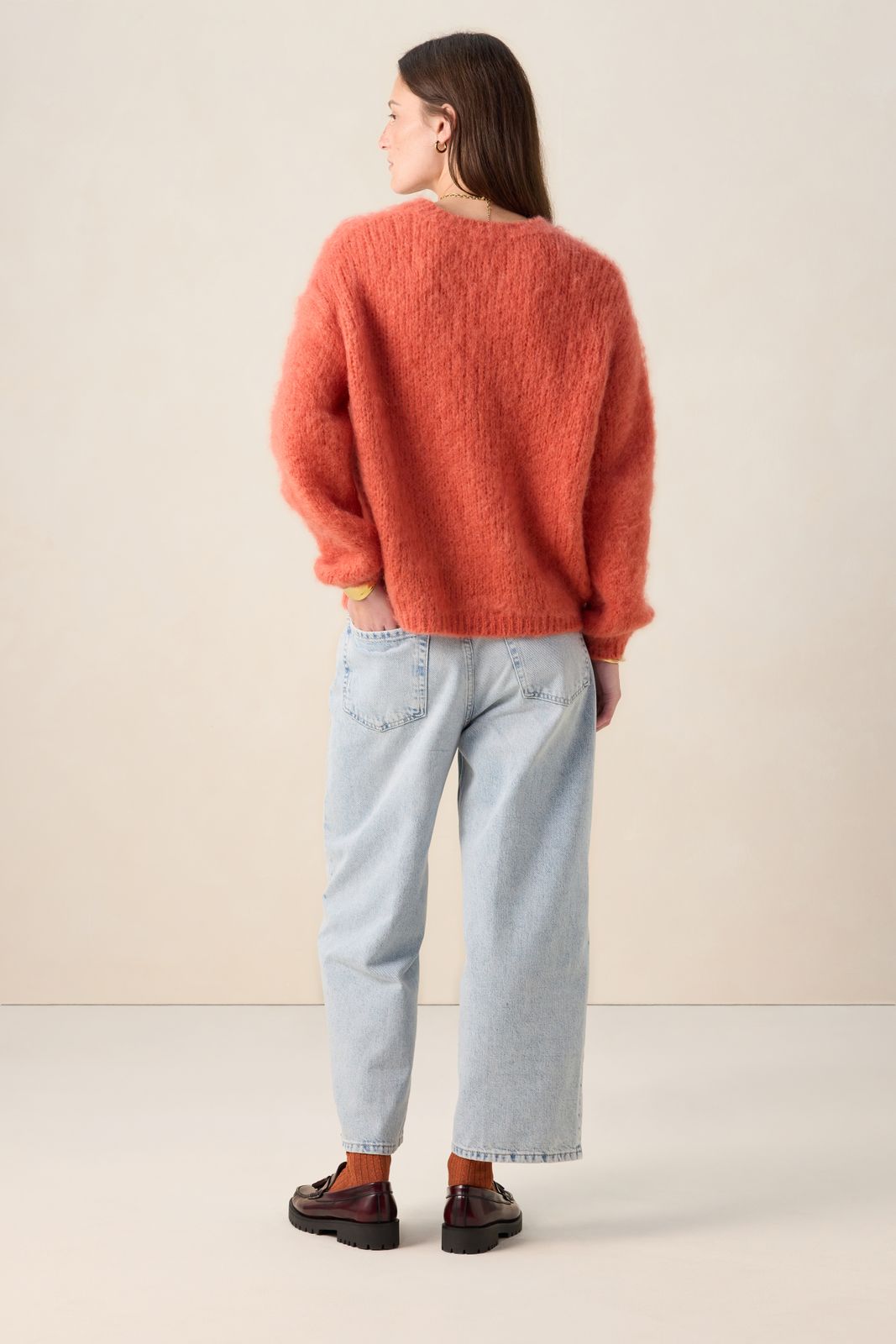 Pull rouge clair de Sissy-Boy. Le pull a des manches longues avec épaules basses, un col rond et une coupe décontractée. Le pull est en matière tricotée. Composition : 53% mohair, 45% polyamide, 2% élasthane.