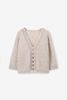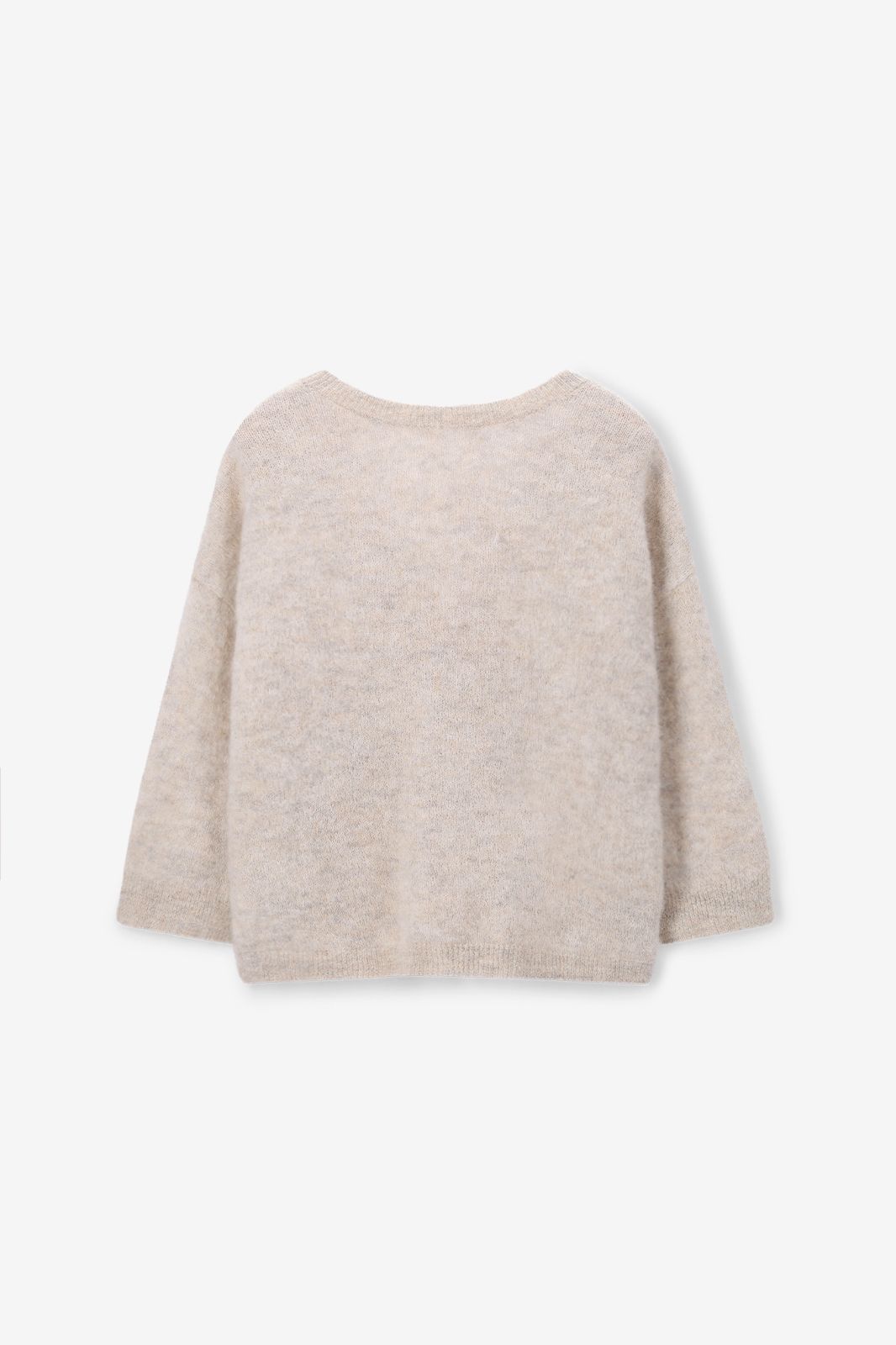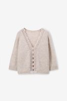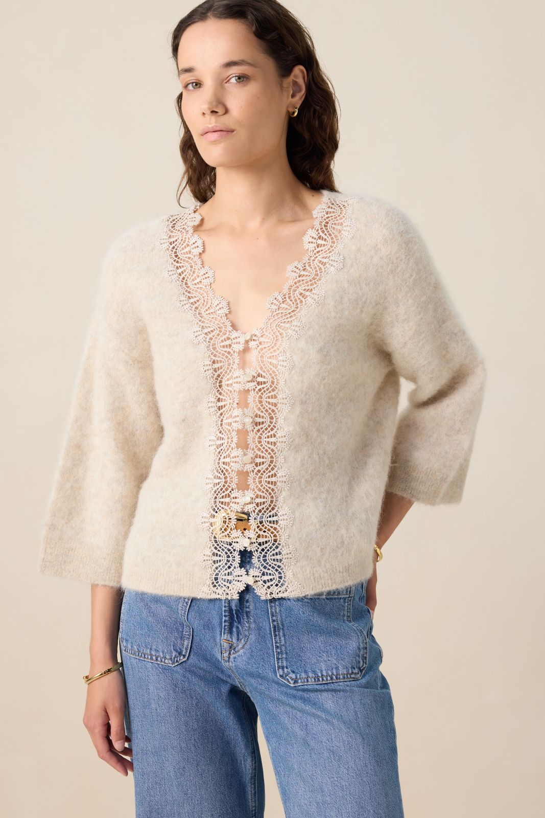 Pull réversible beige avec dentelle de Sissy-Boy. Le pull a des manches longues, un col montant, une fermeture boutonnée et une coupe décontractée. Le pull tricoté peut être porté des deux côtés. Le mannequin mesure 1,74 m et porte une taille S. Composition : 71% laine d'alpaga, 27% polyamide, 2% élasthane.
