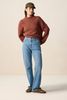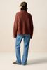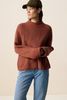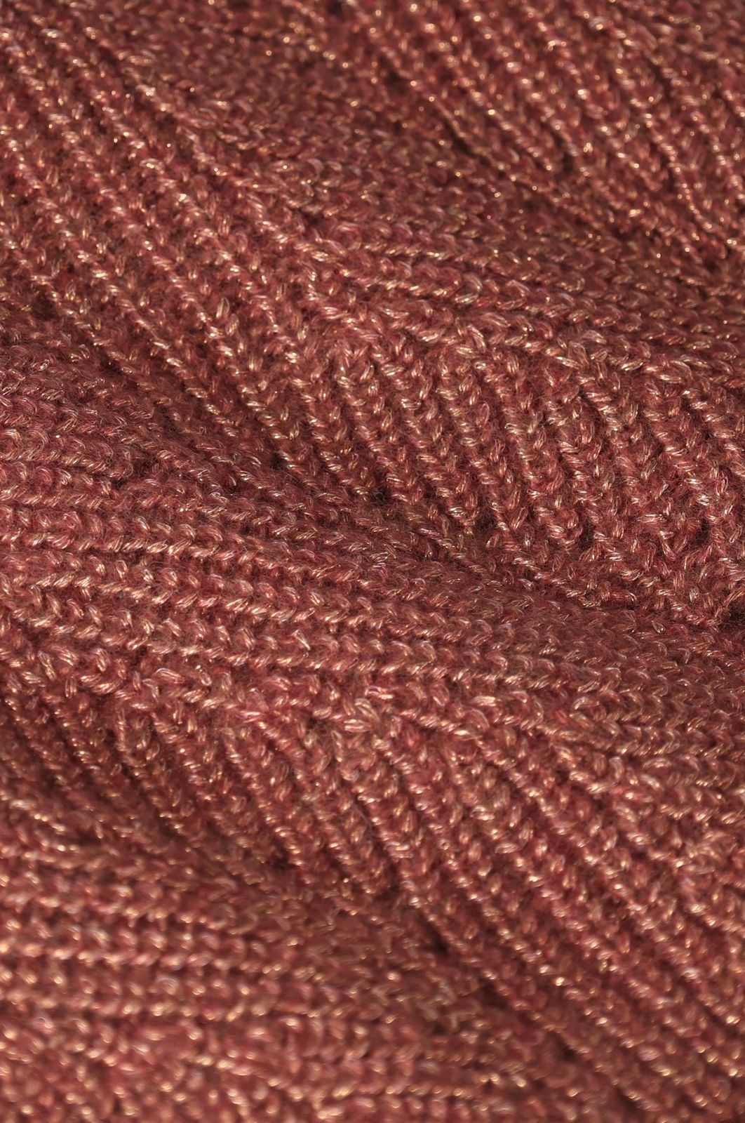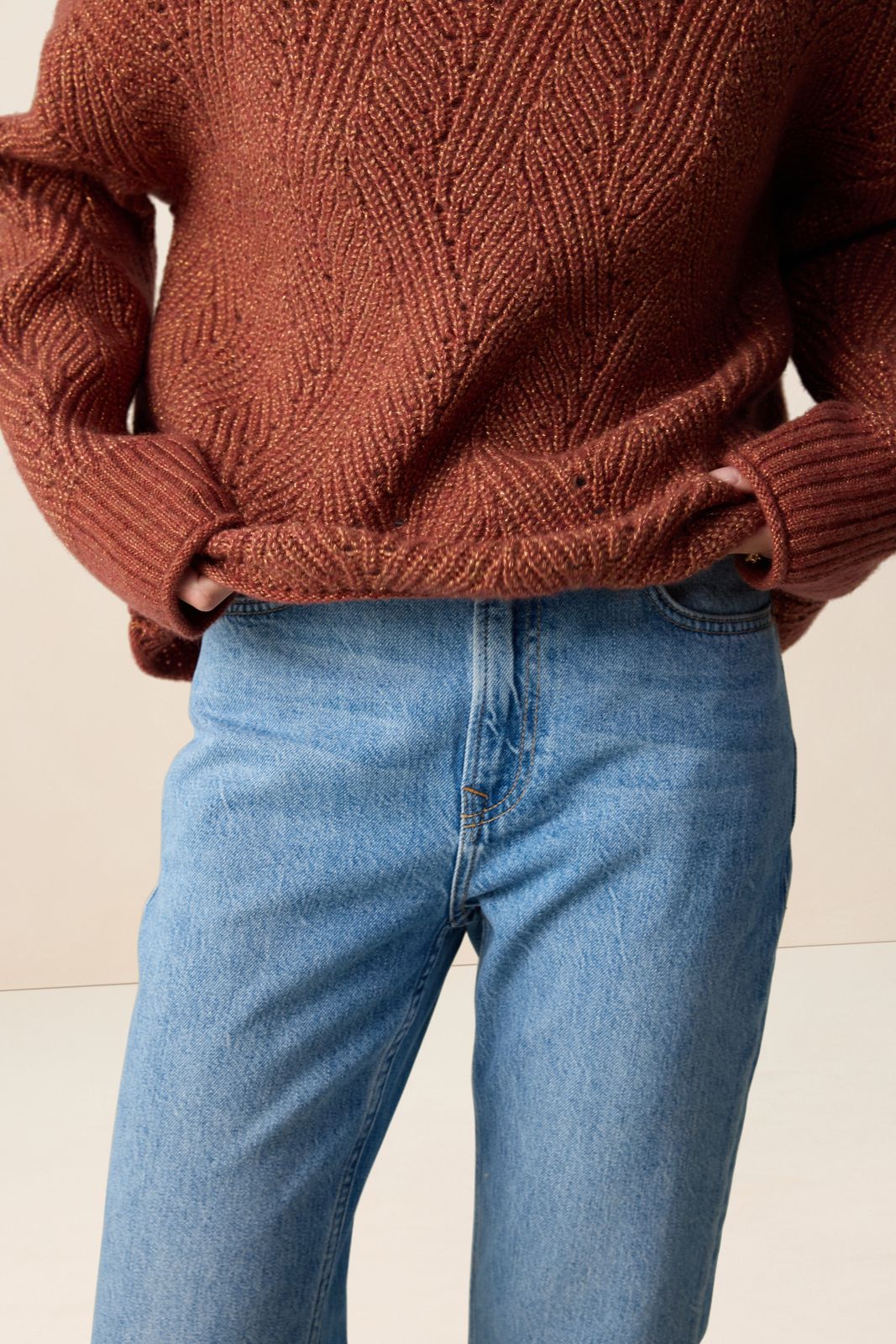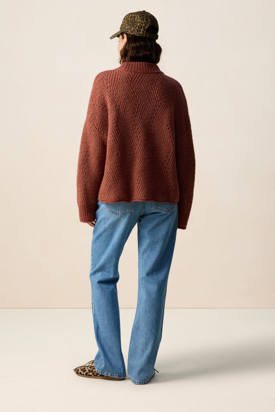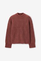 Pull tricoté rouge foncé de Sissy-Boy. Le pull a des manches longues avec épaules basses, un col montant, des bords côtelés et une coupe décontractée. Le pull est doté d'un motif dans le tricot et de fil lurex pailleté. Le mannequin mesure 1,71 m et porte une taille S. Composition : 59% laine, 25% polyester, 16% fibres métalliques.