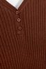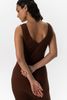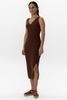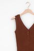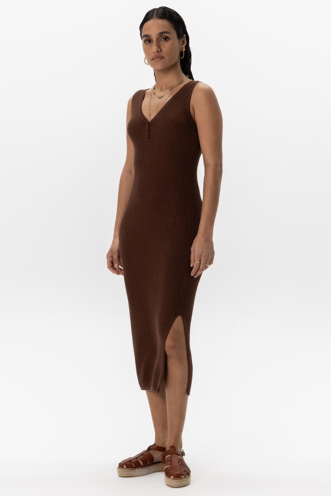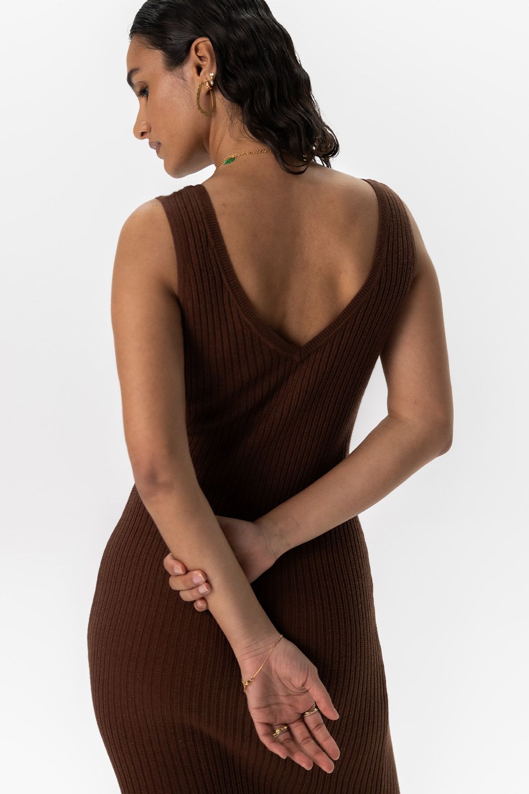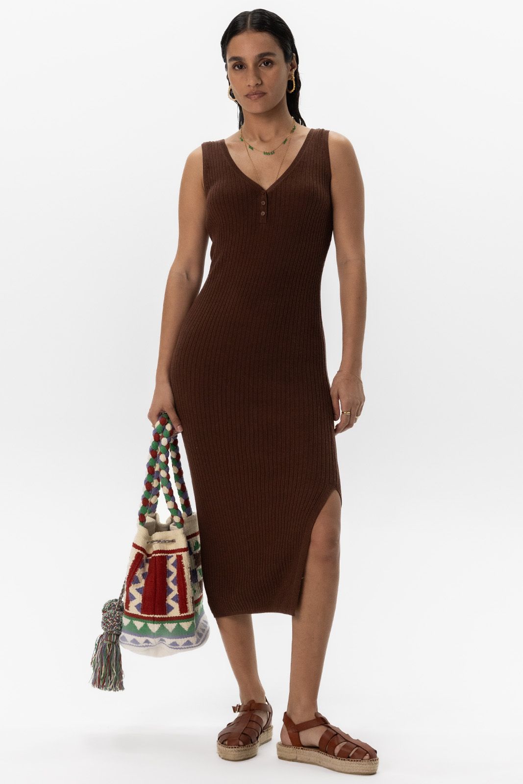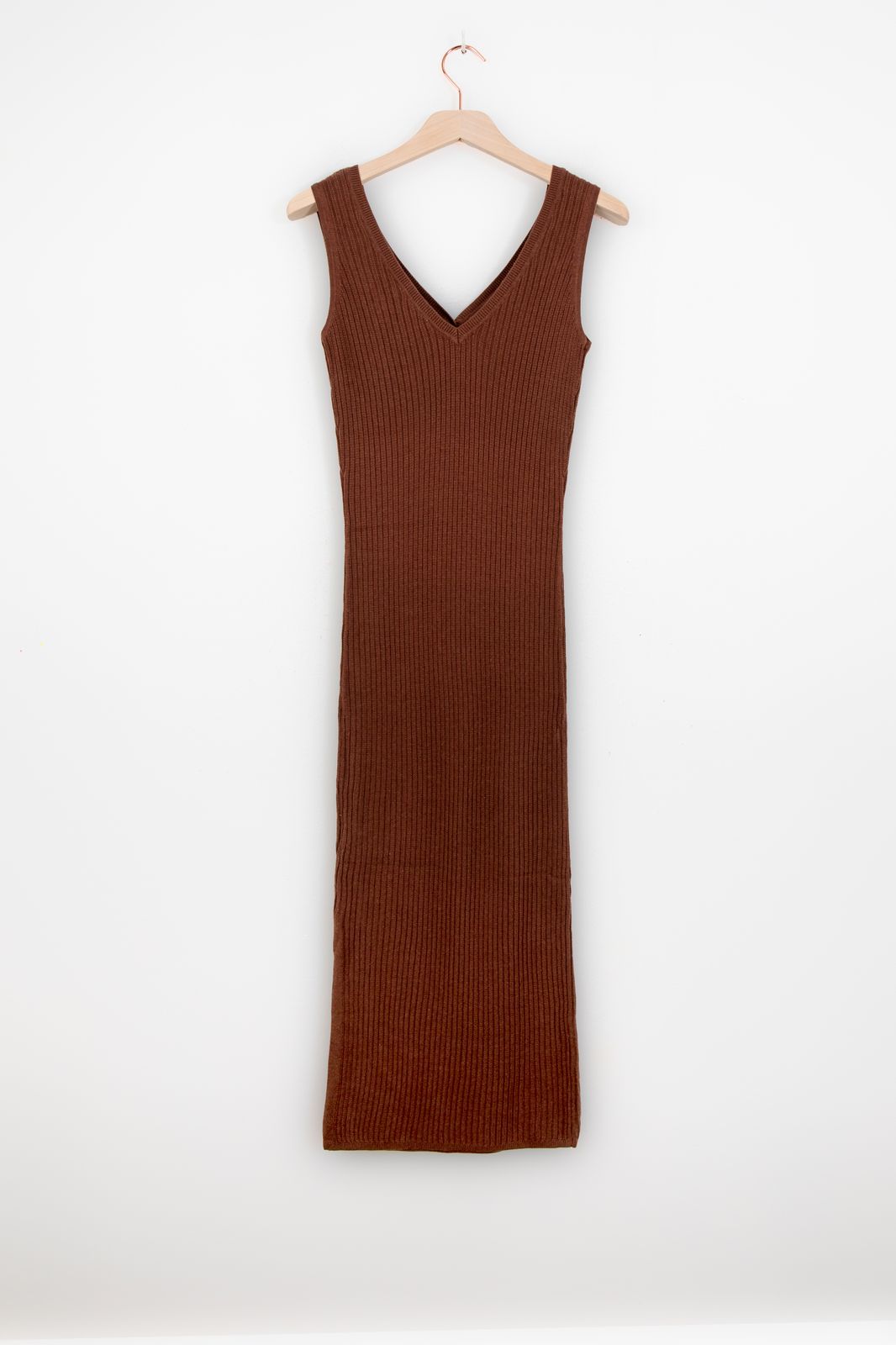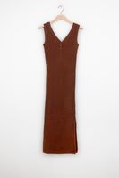 Robe longue maille fine sans manches marron foncé avec un col V, des boutons et une fente dans la couture latérale. Composition : 62% viscose, 37% coton, 1% polyamide.