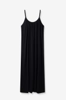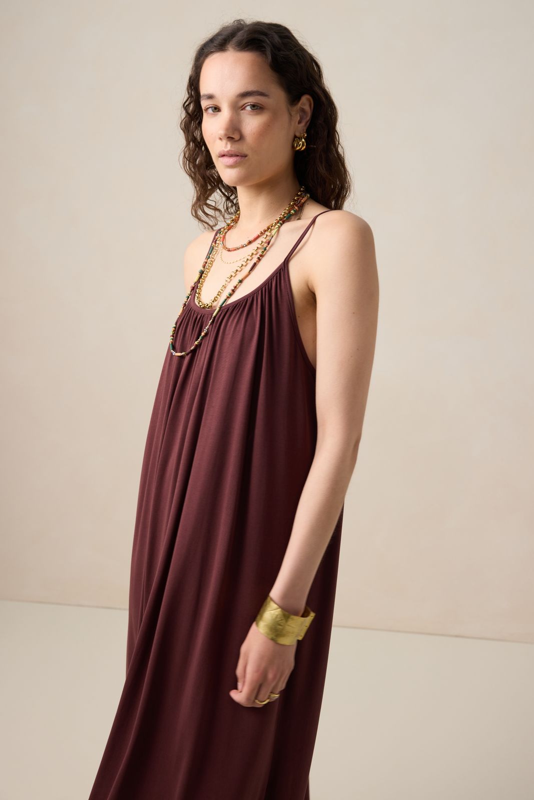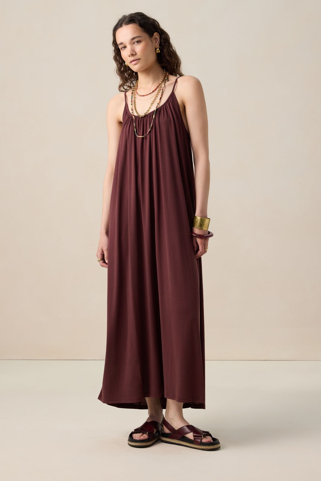 Robe longue plissée rouge foncé de Sissy-Boy. La robe a des bretelles fines et une coupe droite. Composition : 78% modal, 22% polyester.