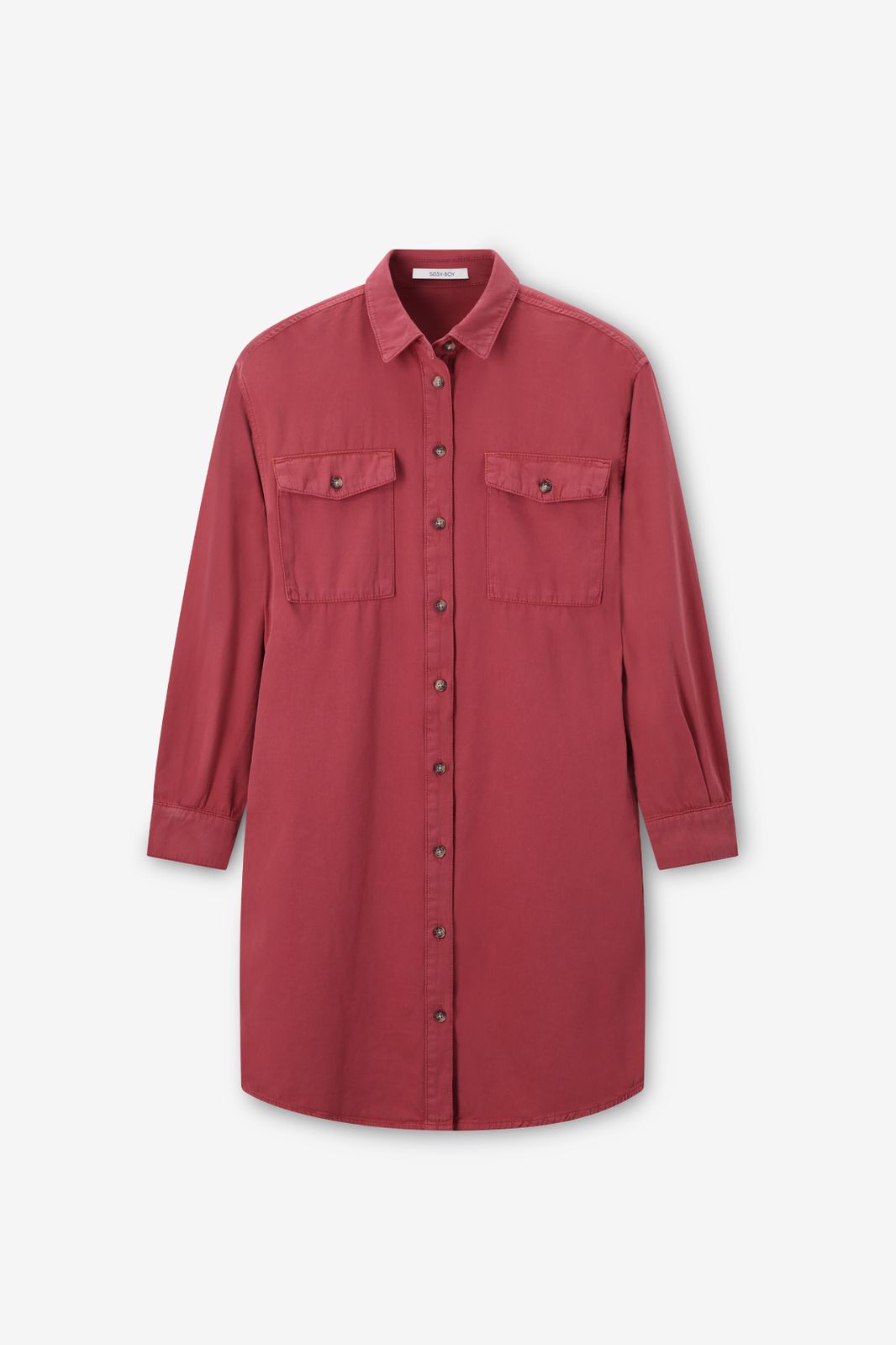 Robe mi-longue rouge foncé de Sissy-Boy. La robe a des manches longues bouffantes, une fermeture boutonnée et un col. La robe est également dotée d'une ceinture à la taille et de deux poches poitrine plaquées. Composition : 100% coton.