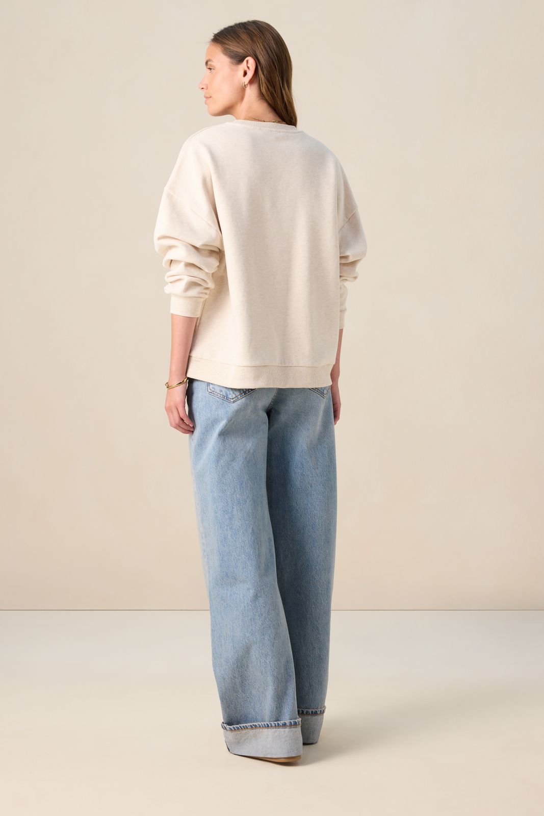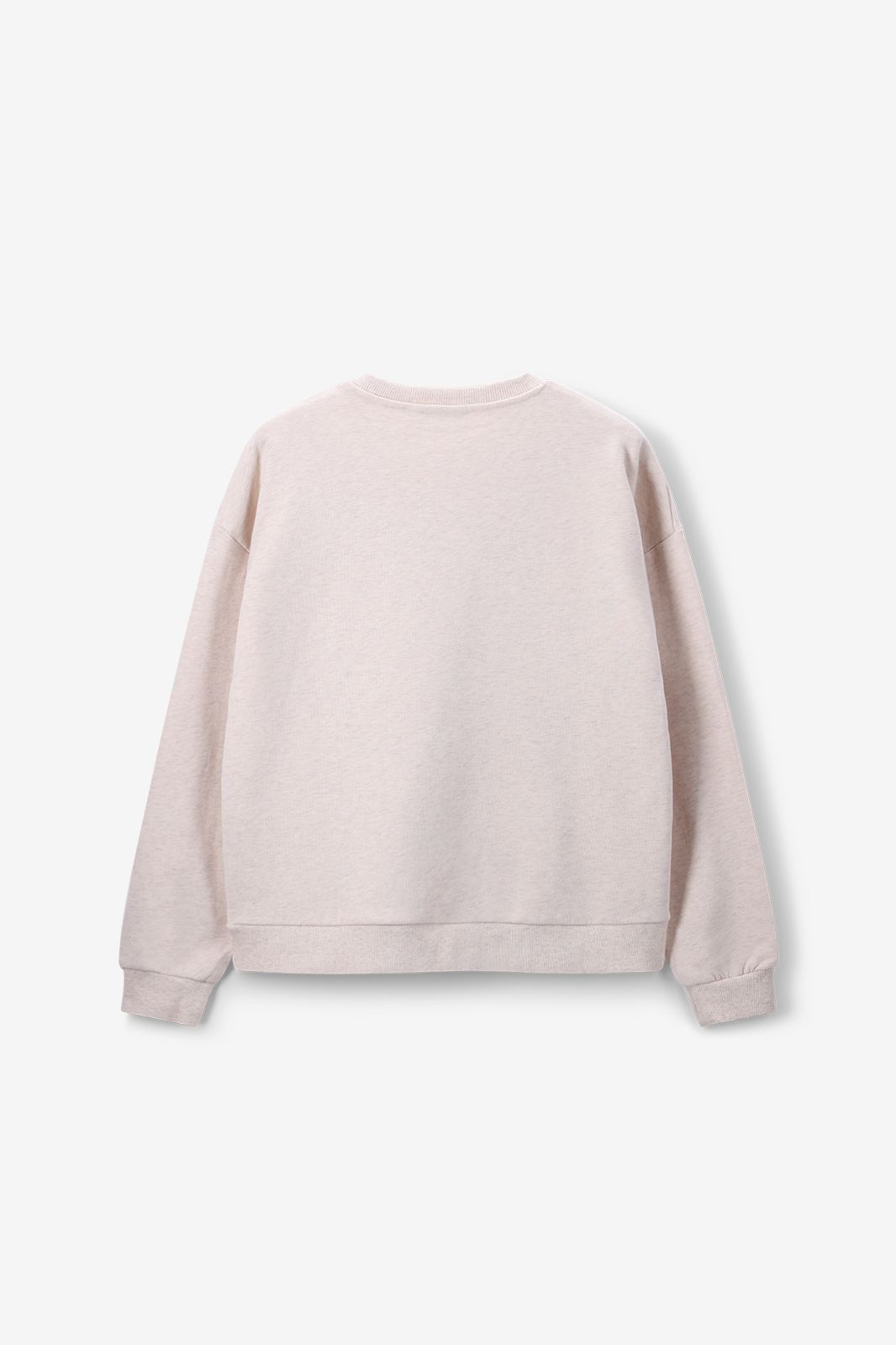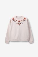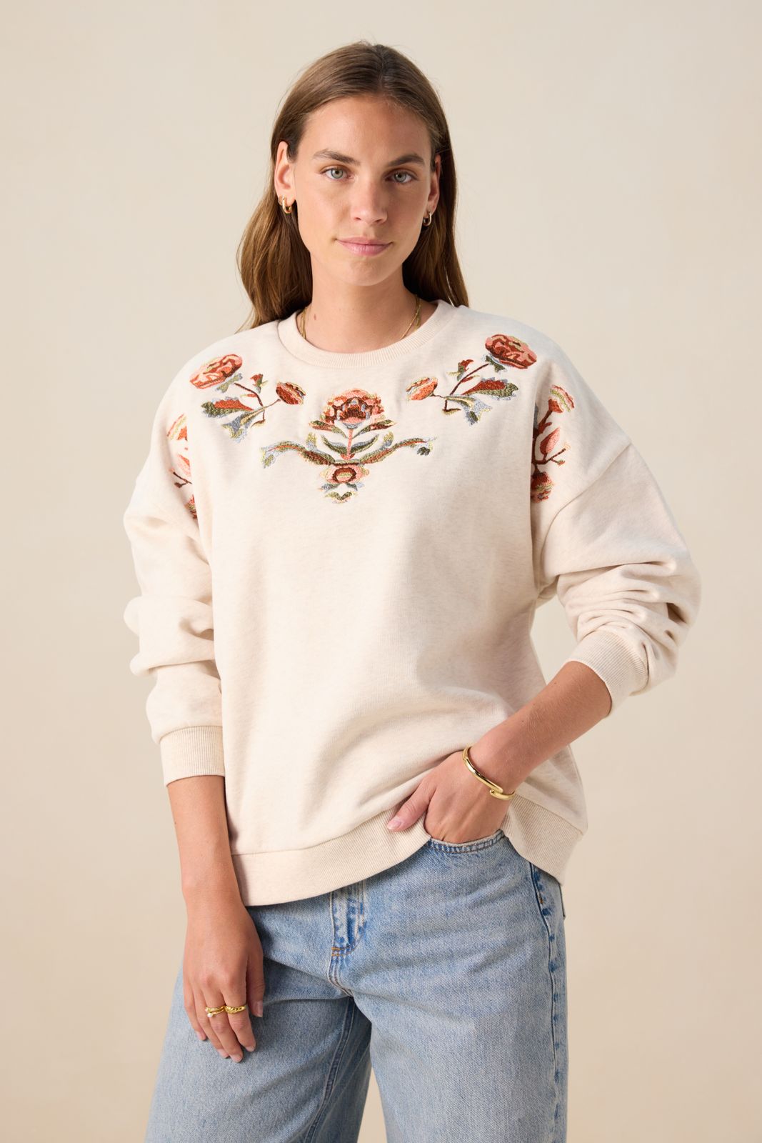 Sweat beige avec broderies de Sissy-Boy. Le sweat a des manches longues, un col rond, une coupe décontractée, et des fleurs brodées au niveau du col et des épaules. Composition : 100% coton.