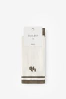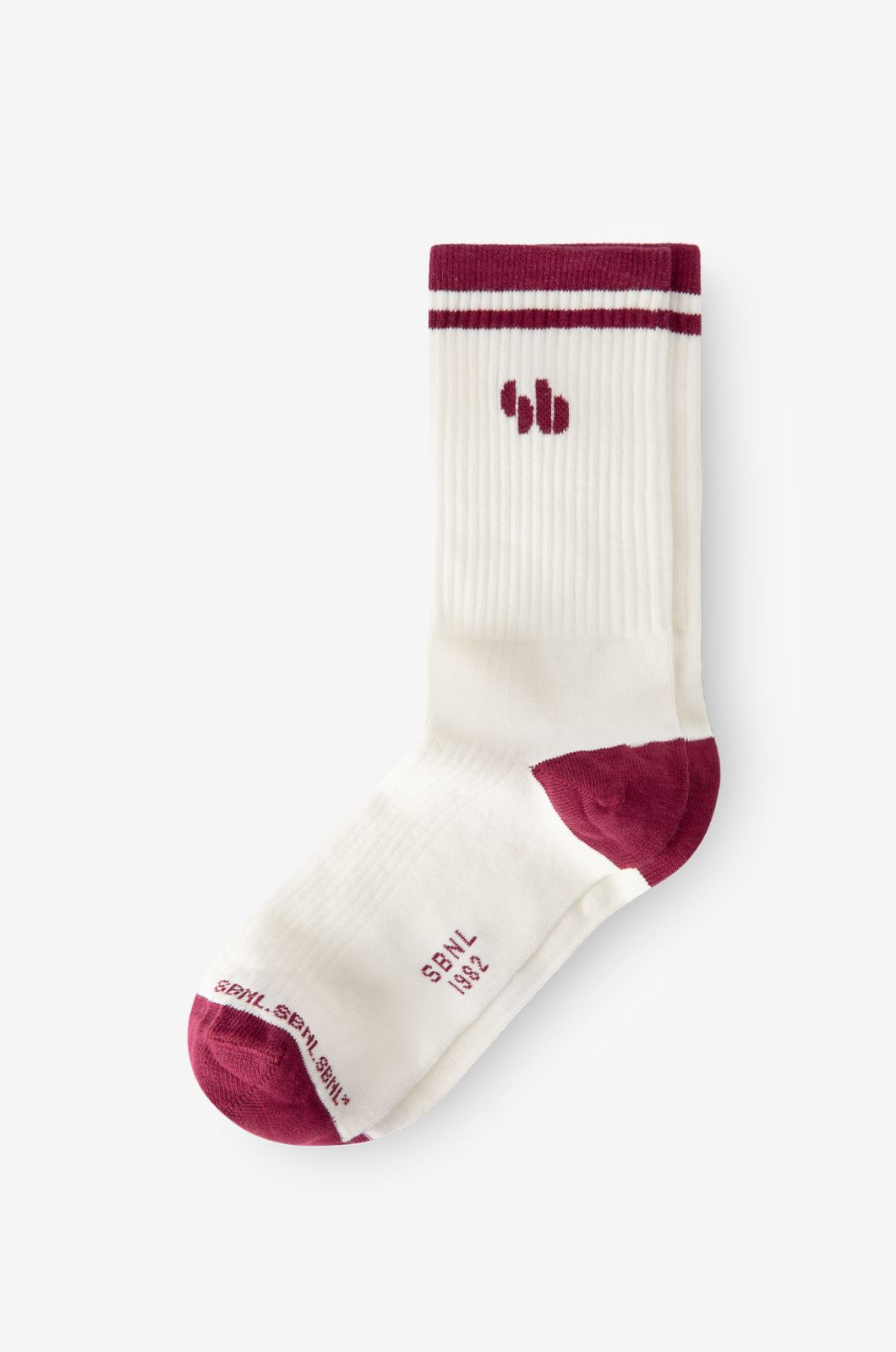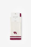 Witte sokken met logo van Sissy-Boy. De sokken hebben een ribstofkwaliteit met bordeaux rode details zoals de twee strepen en het Sissy-Boy logo aan de bovenkant. Materiaal: 79% katoen, 19% polyester, 2% elastaan.