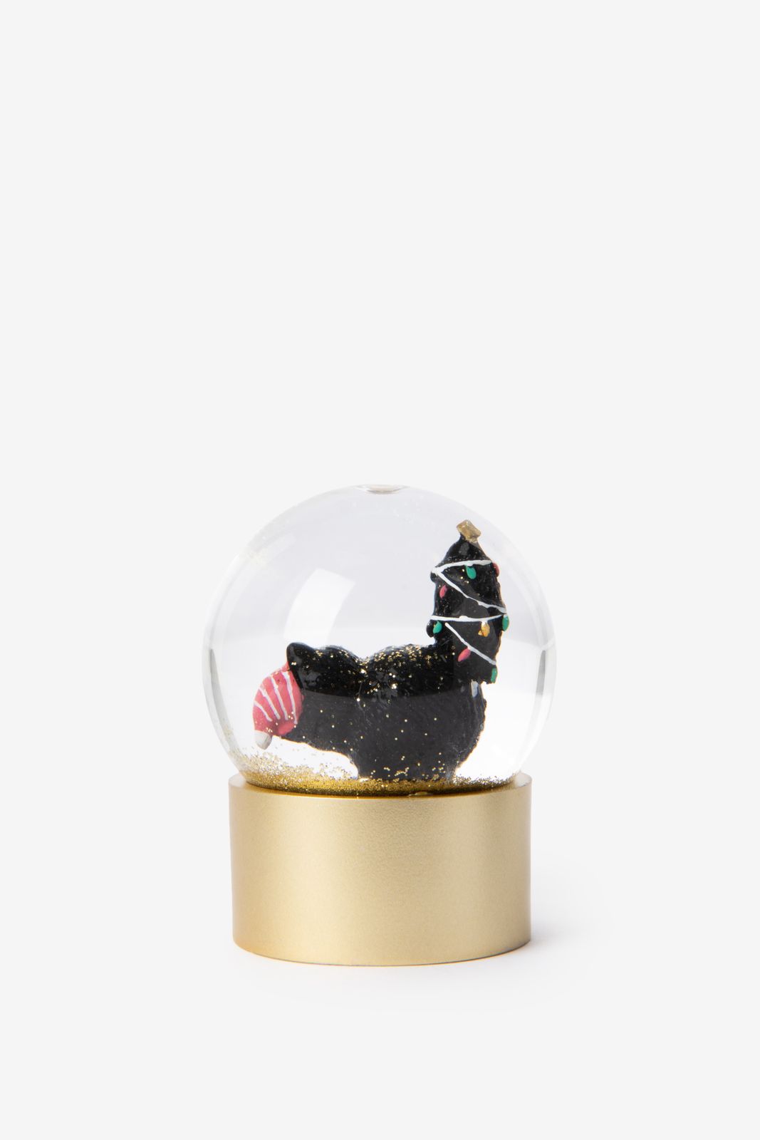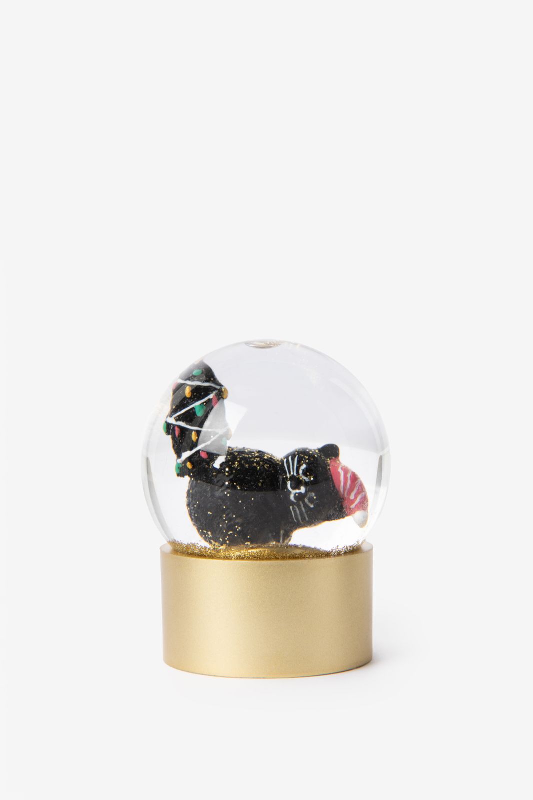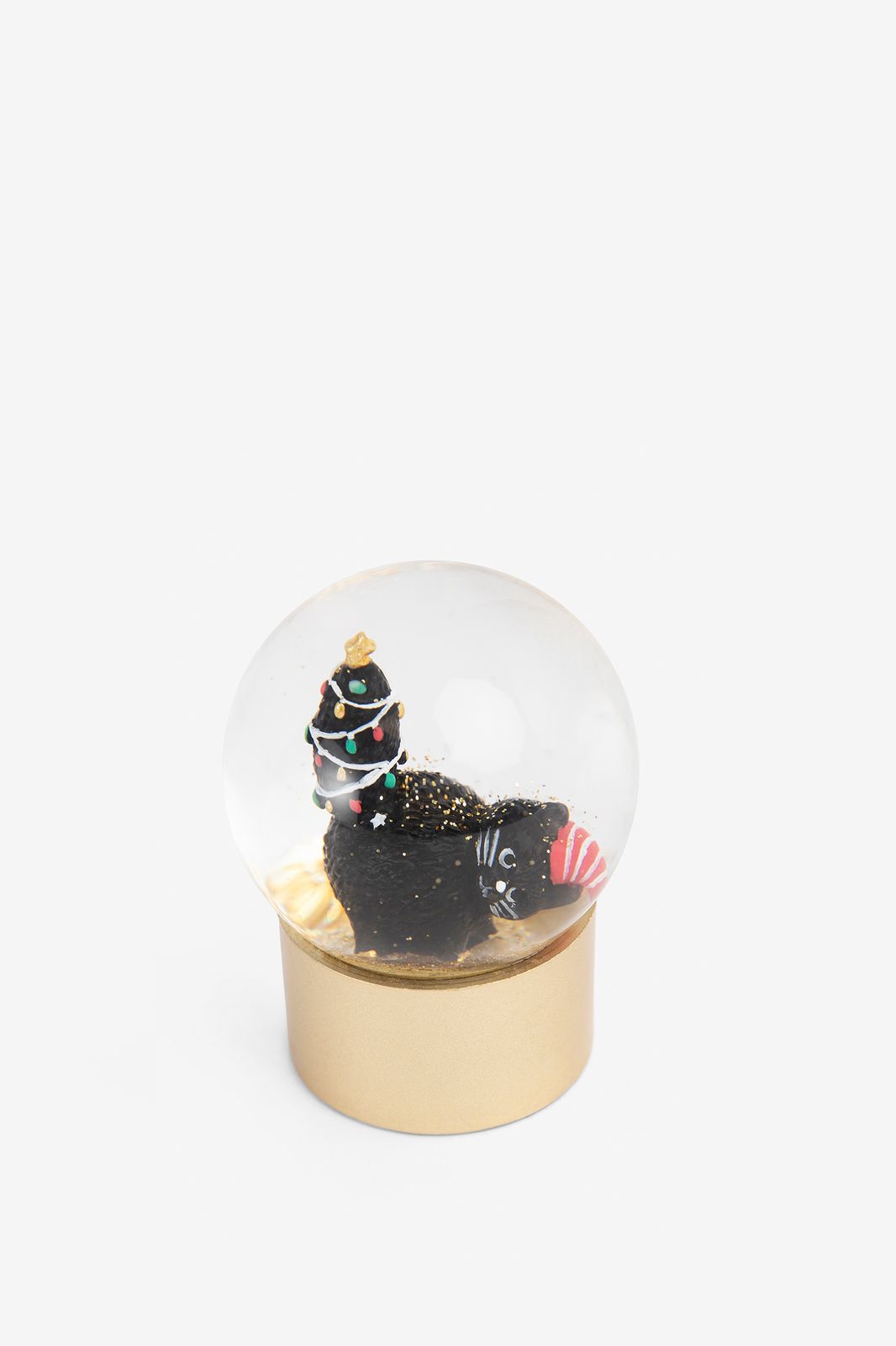 Boule à neige avec chaton empêtré de Sissy-Boy. La boule à neige est remplie d’un petit chat qui s’est empêtré avec sa queue dans les guirlandes de Noël. Mesurant 4,5 cm, cette boule à neige a un petit socle doré et crée une bonne ambiance dans votre maison. Pour un effet festif, secouez la boule et regardez les paillettes dorées qui voltigent !