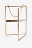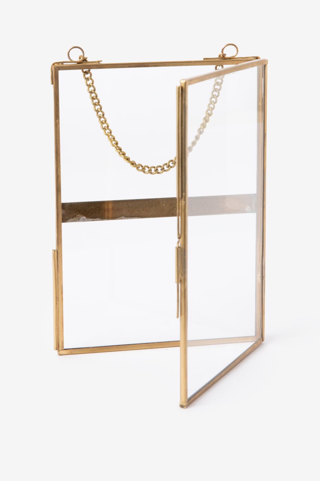 Cadre mural de couleur dorée avec photo entre deux verres, à accrocher au moyen d'une chaîne dorée. Les dimensions du cadre photo sont 18 x 12,5 cm.