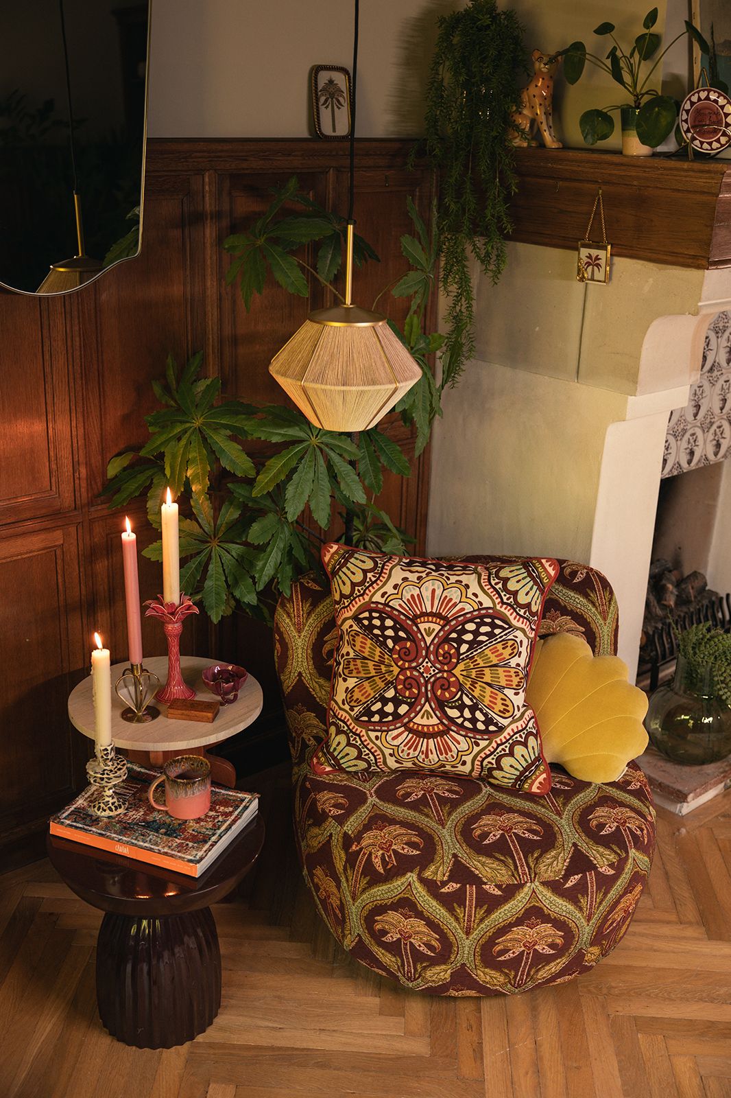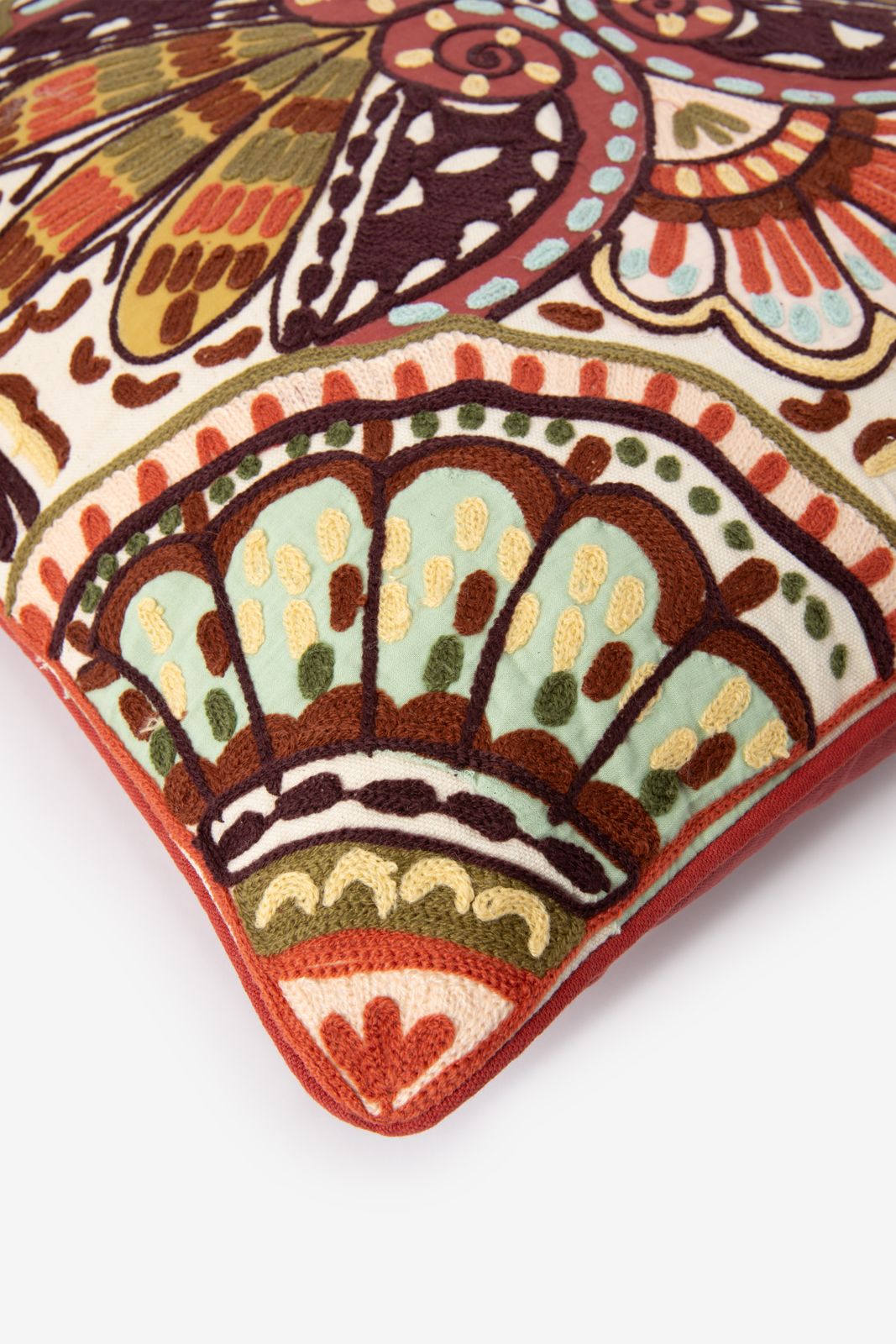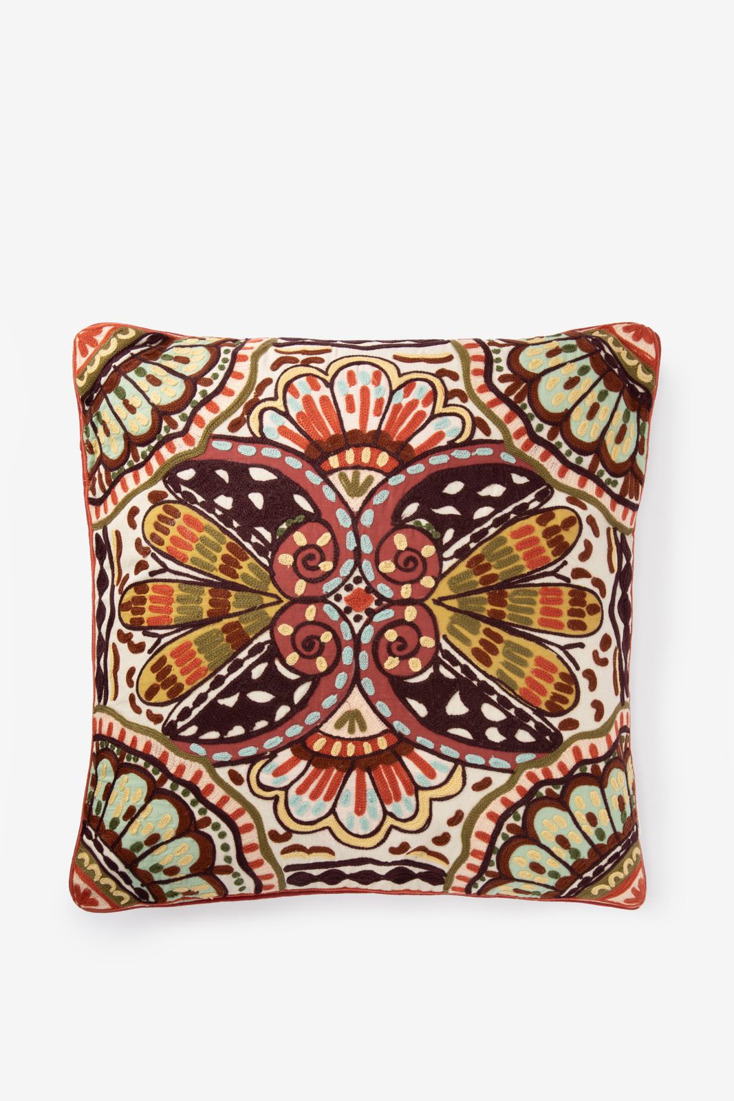Coussin multicolore de Sissy-Boy. Le coussin de couleur rouge foncé est orné d'un imprimé fleuri avec des détails colorés. Dimensions : 50x50 cm. Composition : 100% coton.