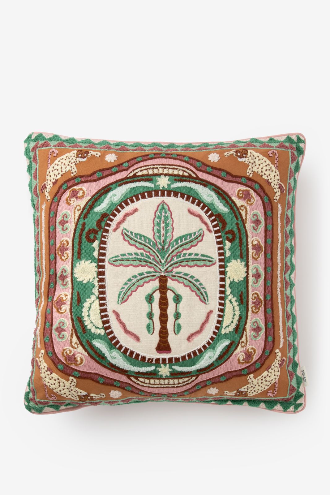 Coussin multicolore de Sissy-Boy. Le coussin est orné d'un grand palmier sur le devant avec des léopards sur les bords. Conseils d'entretien : laver séparément à 30 degrés, ne pas passer au sèche-linge, repasser à basse température, ne pas utiliser de produits contenant des agents de blanchiment et ne pas nettoyer à sec. Dimensions : 50x50 cm. Composition : 100% coton. Matière rembourrage : 100% polyester.