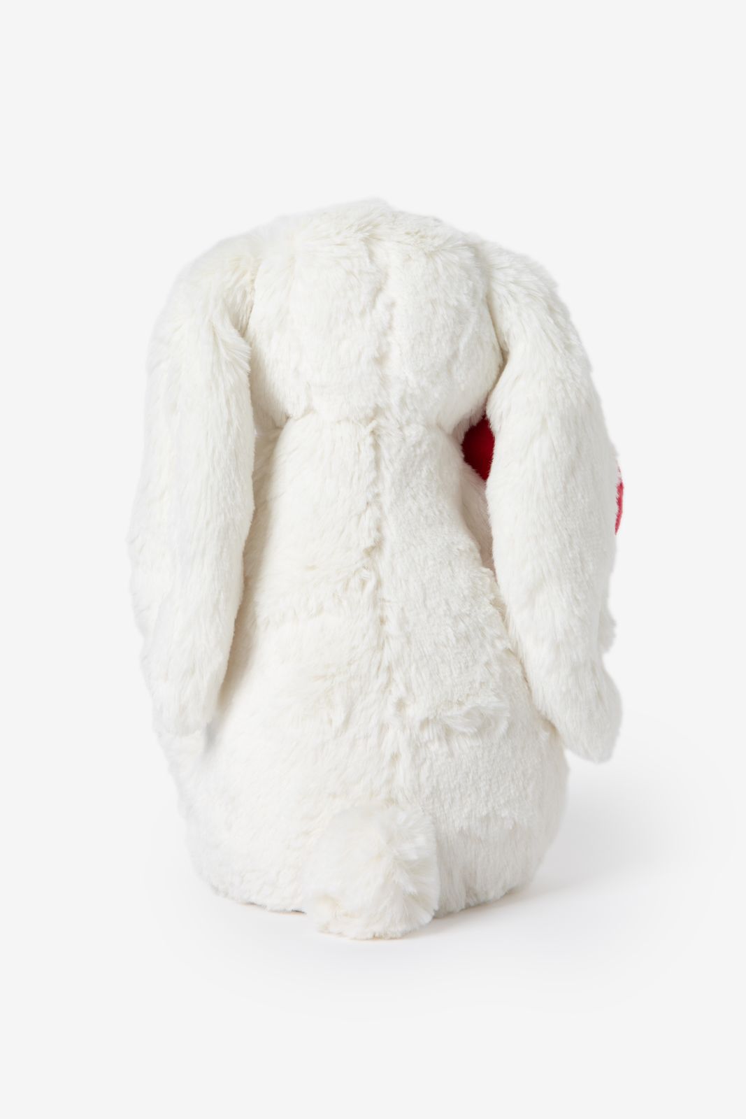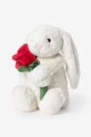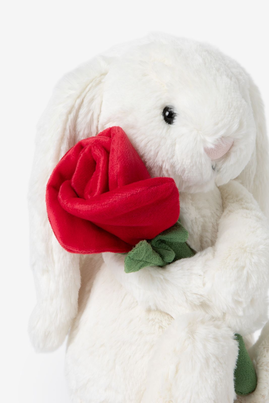 Peluche blanche de la marque Jellycat. La peluche blanche a la forme d'un lapin assis tenant une rose. Dimensions : 31 cm. Composition : 100% polyester.