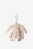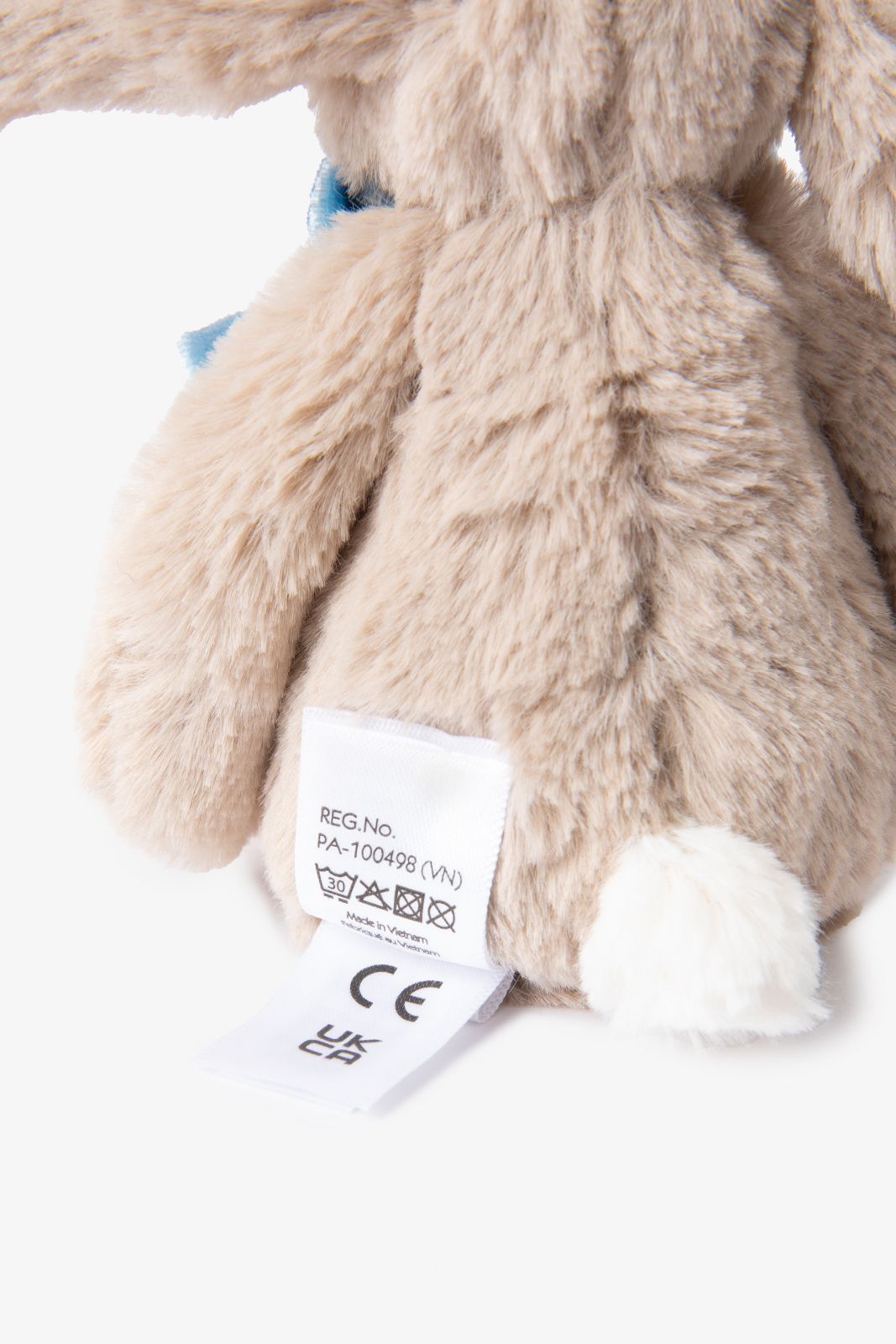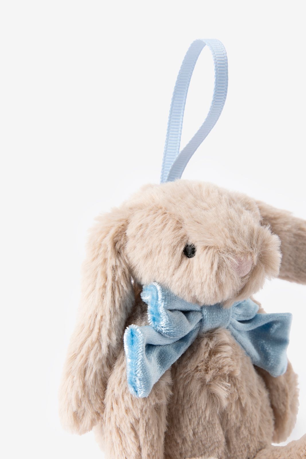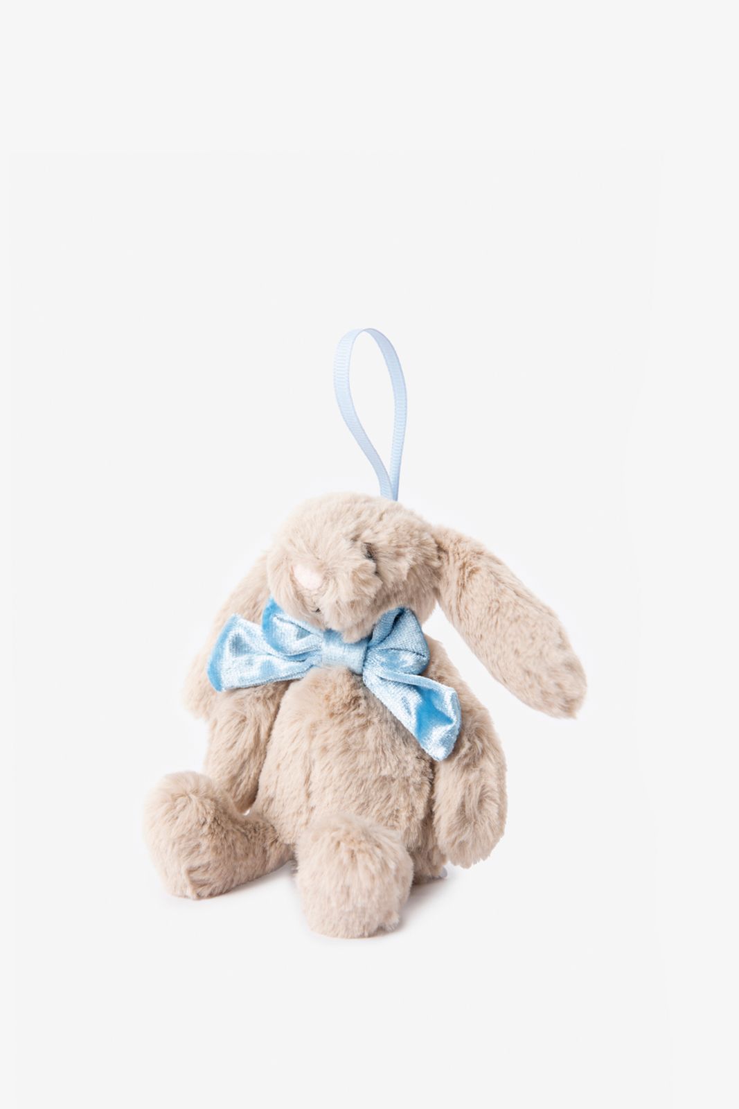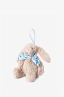 Peluche de la marque Jellycat. La peluche a la forme d'un lapin avec un gros nœud bleu autour du cou. Dimensions : 13x6x4 cm. Composition : 99,7% polyester, 0,3% spandex.