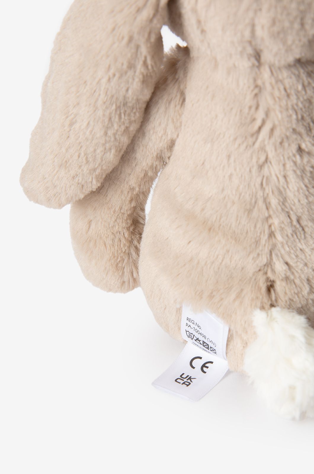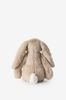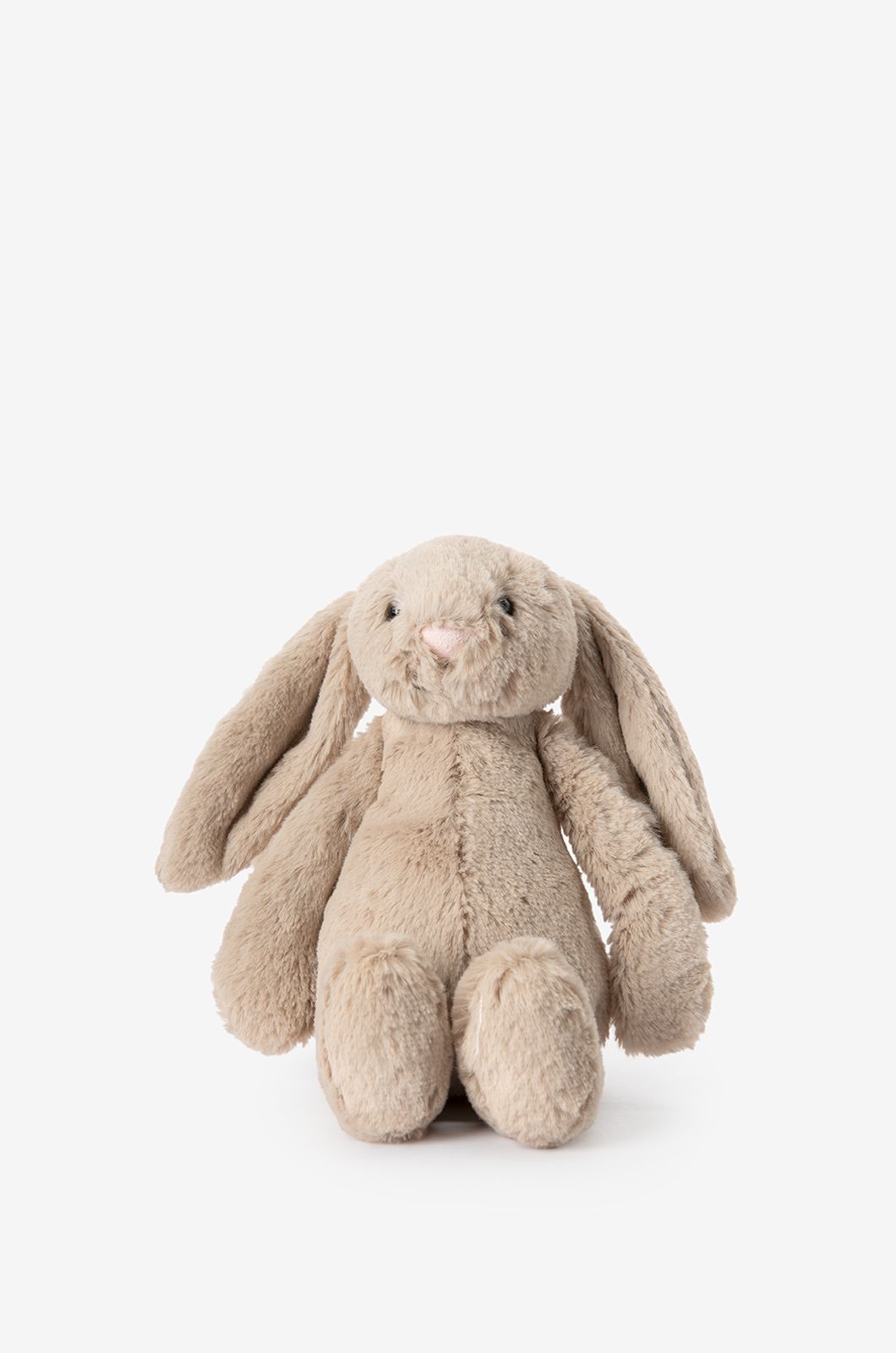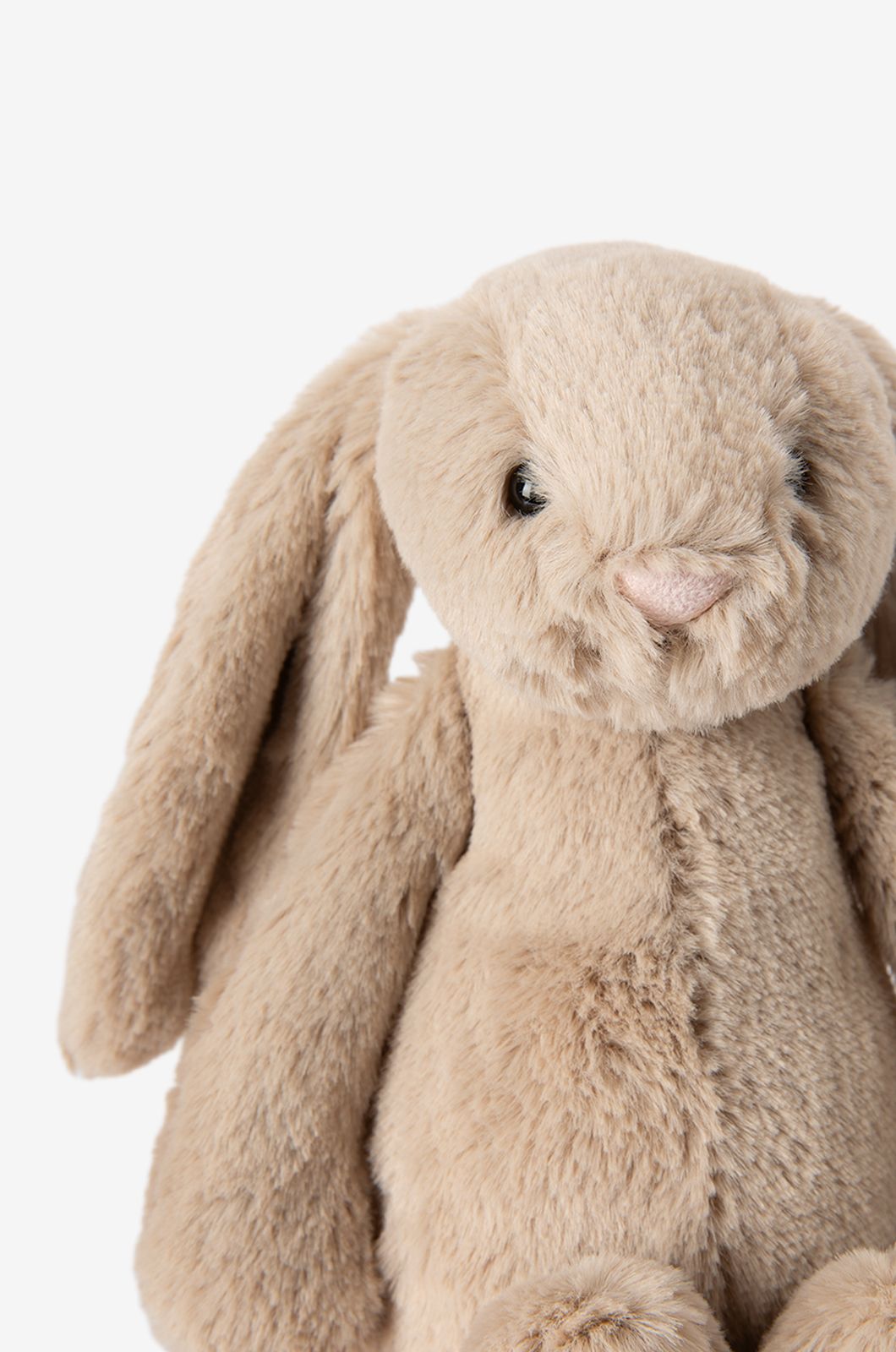 Peluche de la marque Jellycat. La peluche a la forme d'un lapin beige et marron clair avec un visage. Dimensions : 8x9x18 cm. Composition : 100% polyester. Conseils d'entretien : laver à la main.