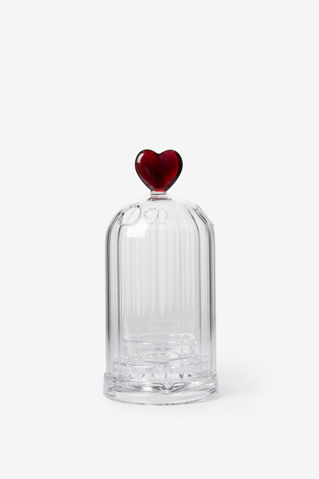 Photophore en verre de Sissy-Boy. Le photophore en forme de cloche est orné d'un romantique cœur rouge sur le dessus. Dimensions : 14,5x7,5 cm. Composition : 100% verre.