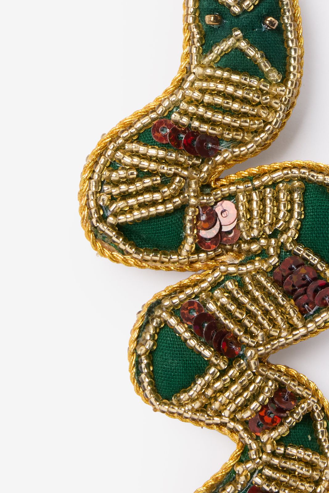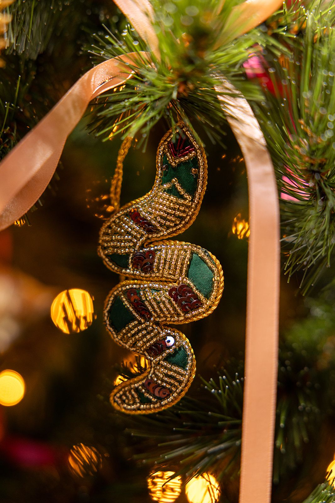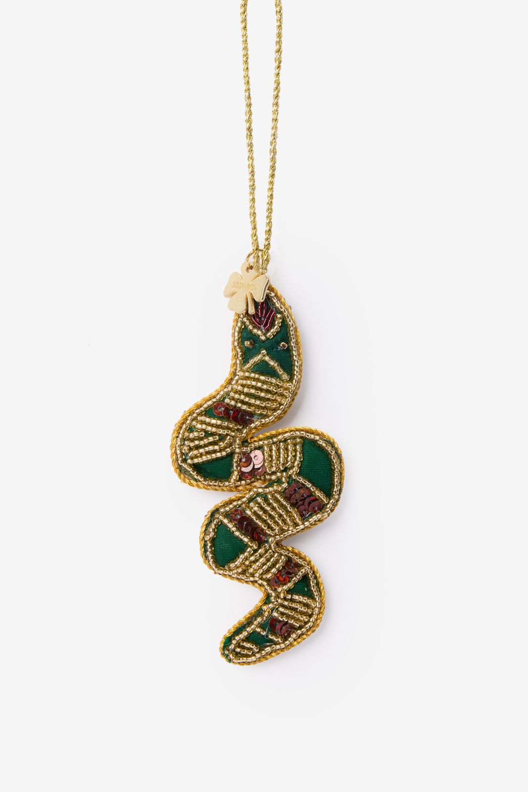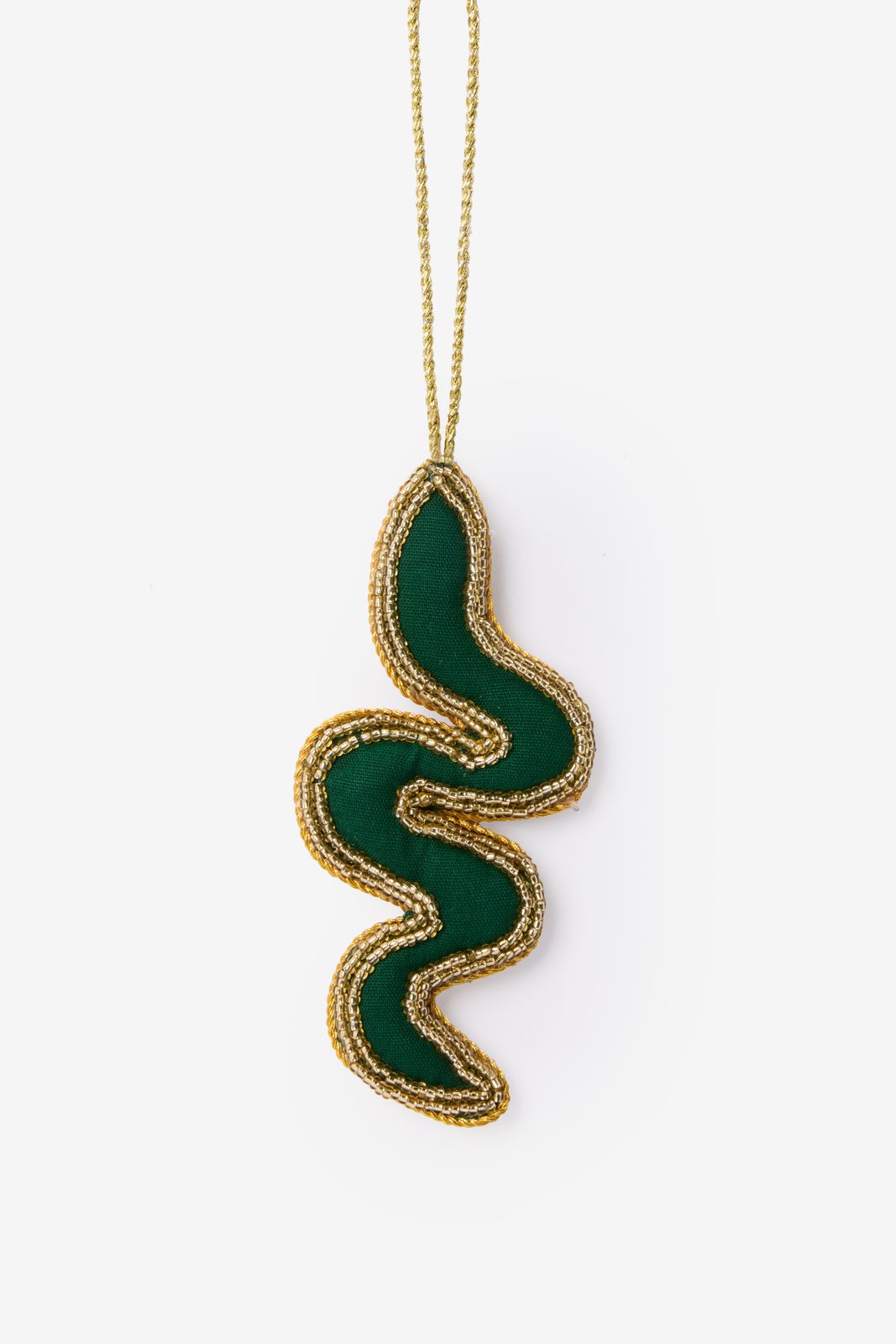 Suspension de Noël vert foncé de Sissy-Boy. La suspension est en forme de serpent avec un motif en perles dorées. Dimensions : 11,5 cm. Composition : 60% polyol, 22% coton, 10% lurex, 8% verre.