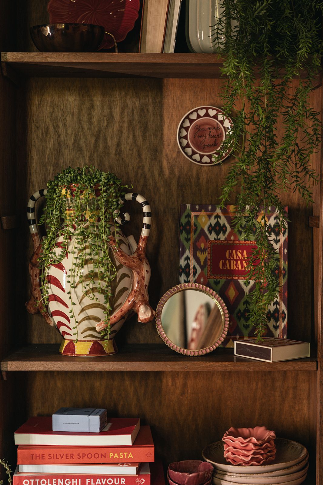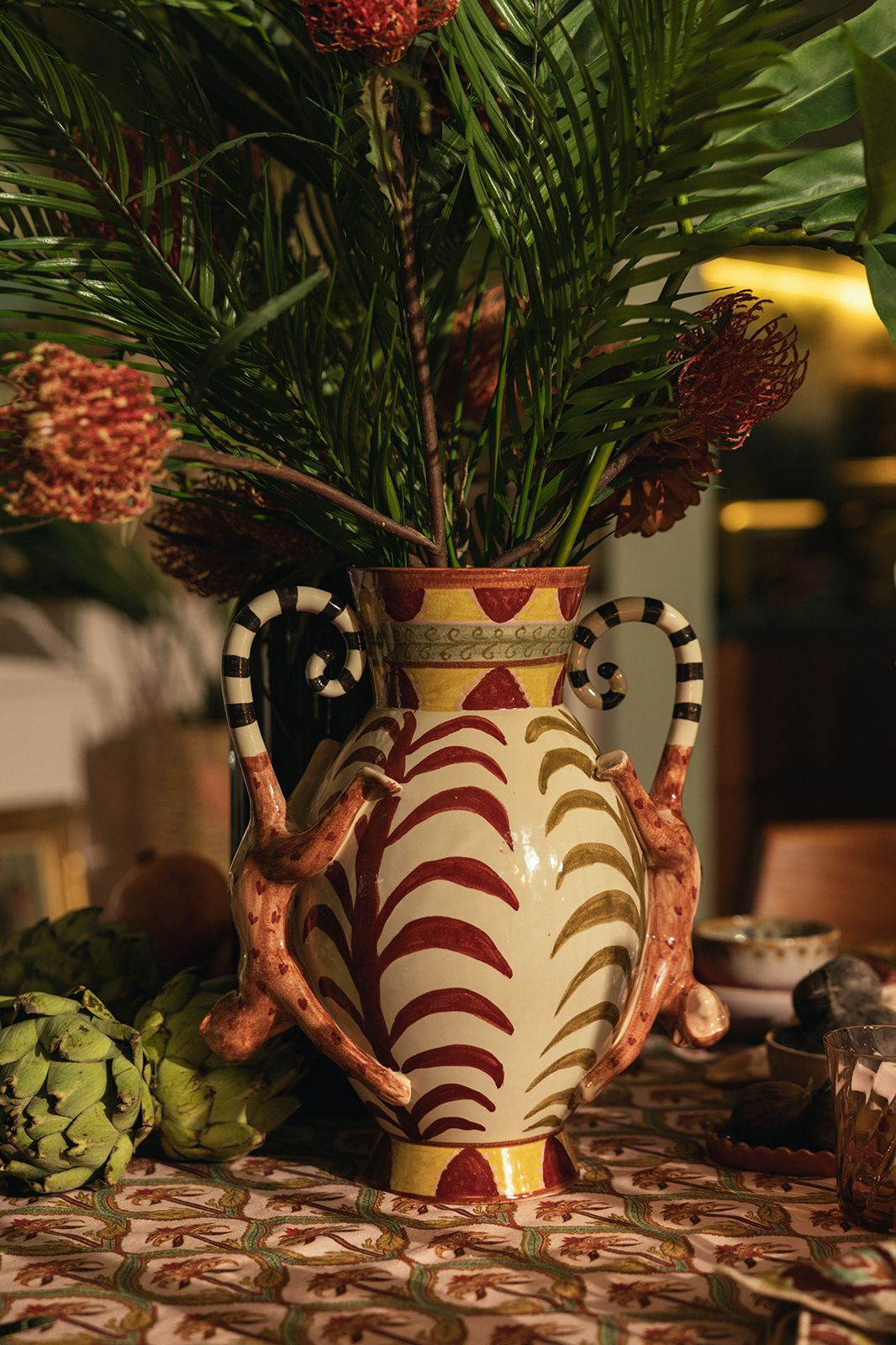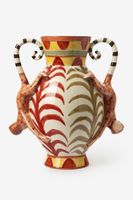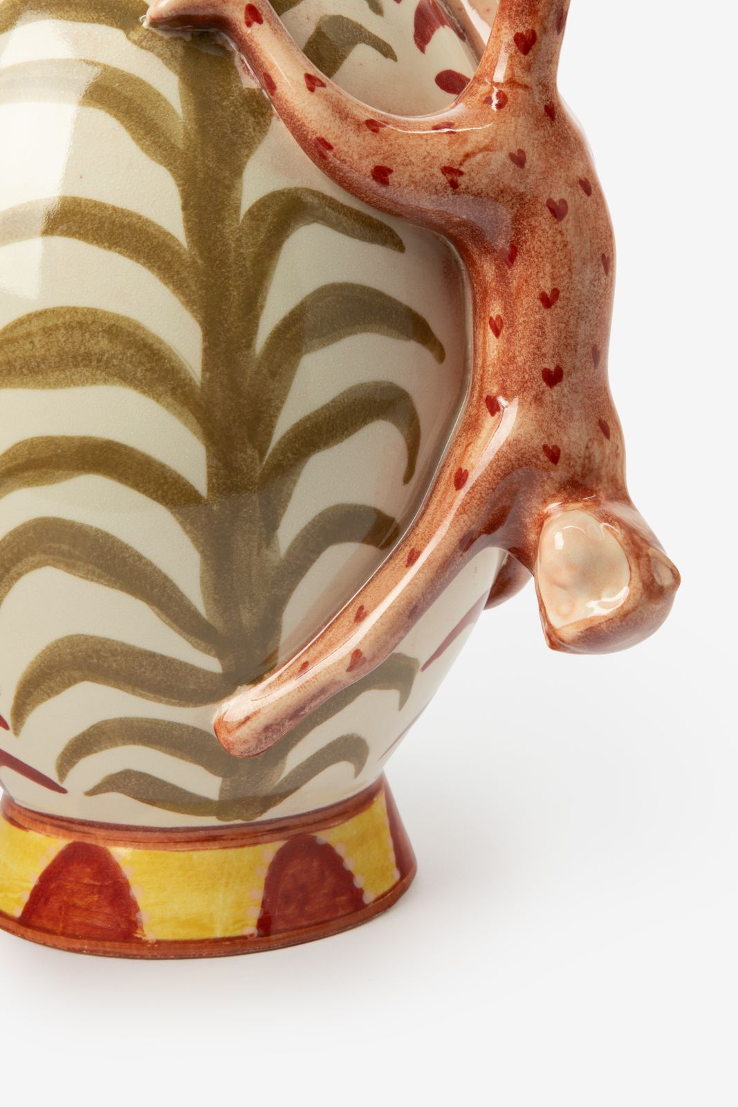 Vase multicolore de Sissy-Boy. Le vase est orné d'un motif peint composé de feuilles vertes et rouges. Sur la partie supérieure et la partie inférieure, il y a des détails rouges et jaunes. De chaque côté, le vase a des anses en forme de singe avec des petits cœurs. Composition : 100% céramique. Attention : le vase a un délai de livraison plus long et ne sera disponible en ligne qu'à partir de la mi-octobre 2025. Le paiement différé n'est donc pas possible pour le moment.