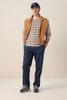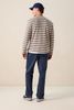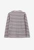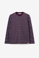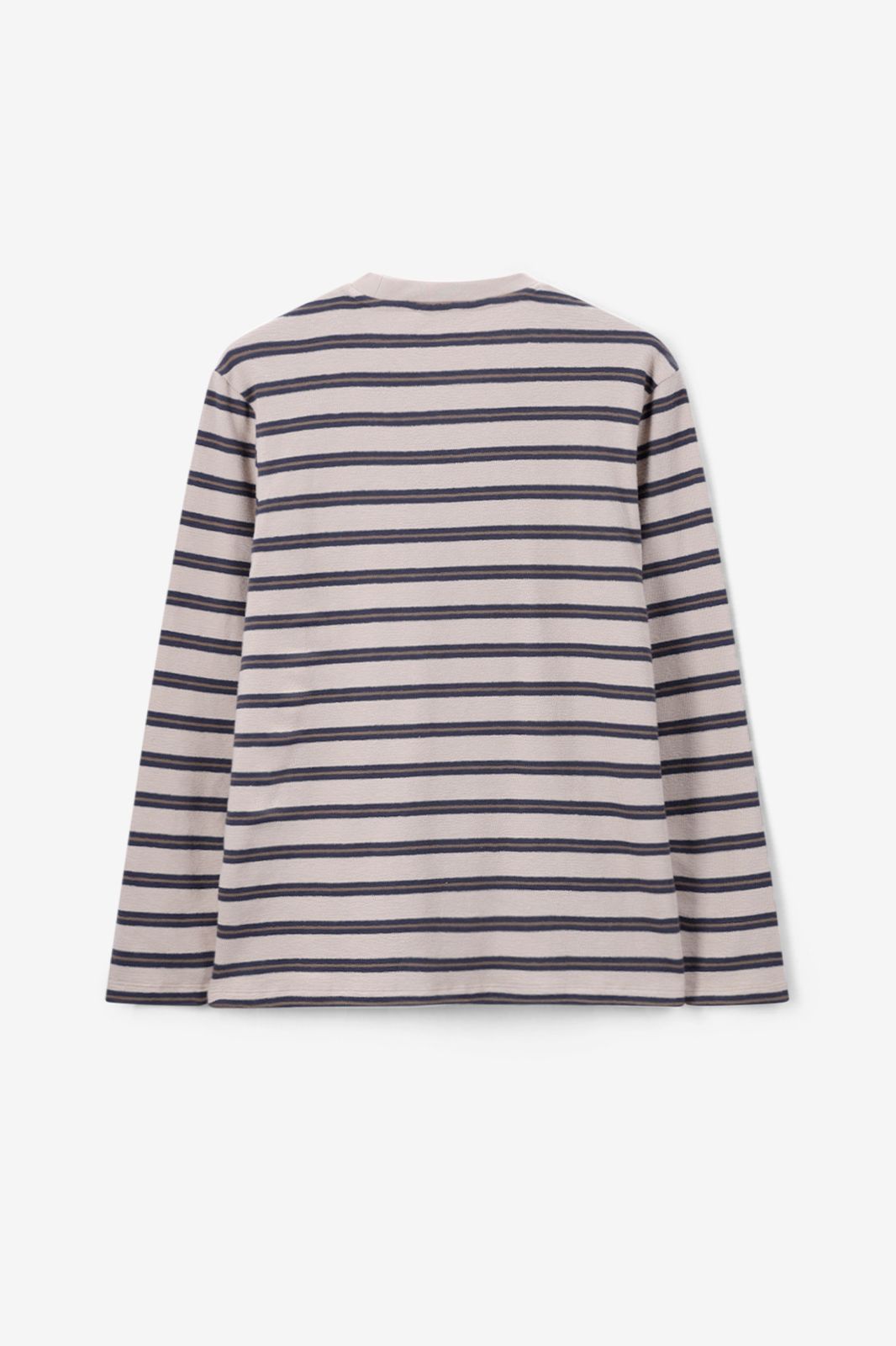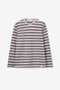 T-shirt beige de Sissy-Boy. Le t-shirt a des manches longues, un col rond montant et une coupe droite. Le t-shirt est également doté de rayures horizontales bleues et jaunes. Le t-shirt est en tissu flammé pour une texture légèrement épaissie. Le mannequin mesure 1,87 m et porte une taille M. Composition : 100% coton.