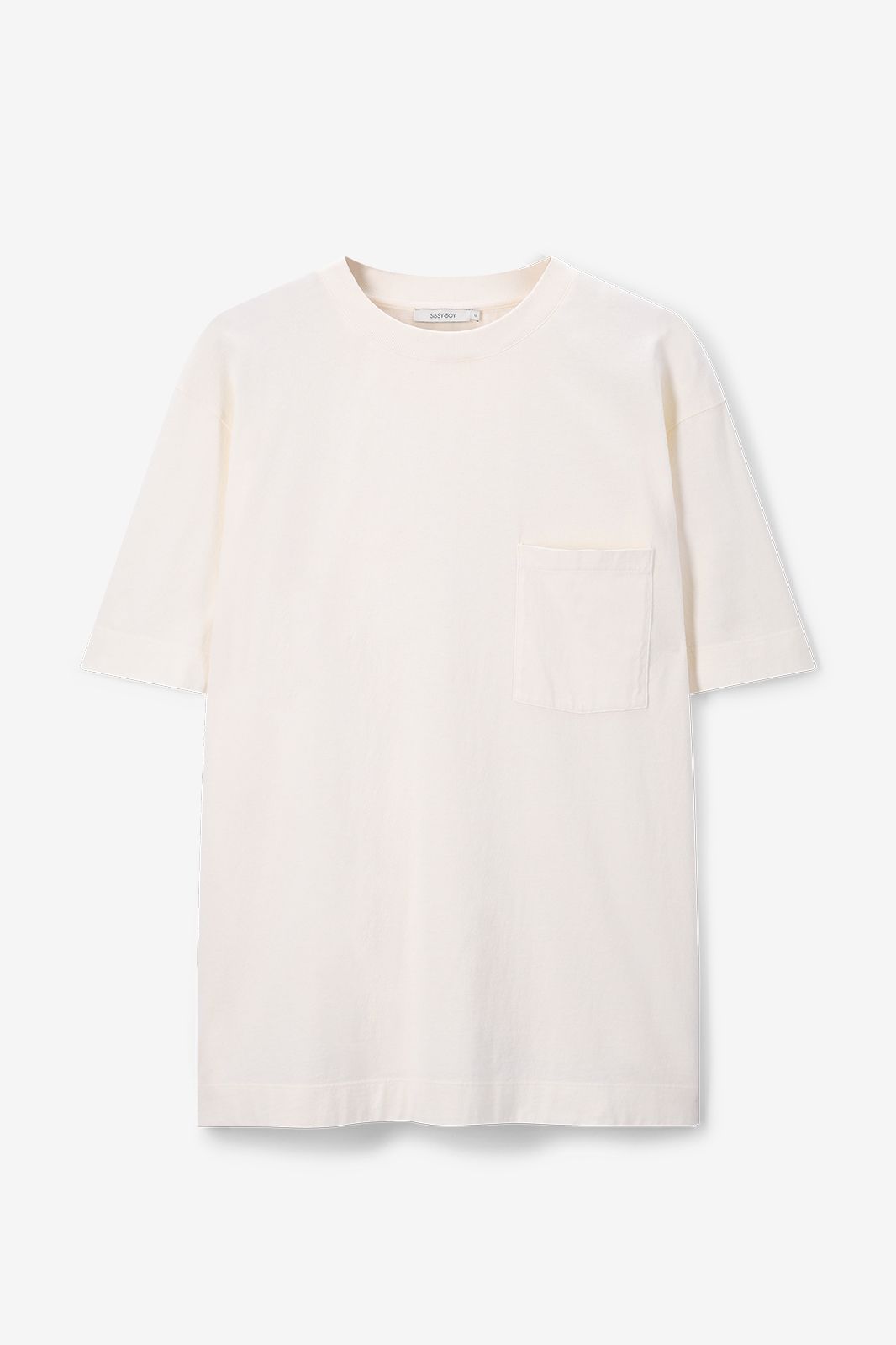 T-shirt blanc de Sissy-Boy. Le t-shirt a un col rond, des manches courtes et une coupe ample. Le t-shirt a également une poche poitrine. Le mannequin mesure 1,87 m et porte une taille M. Composition : 100% coton.